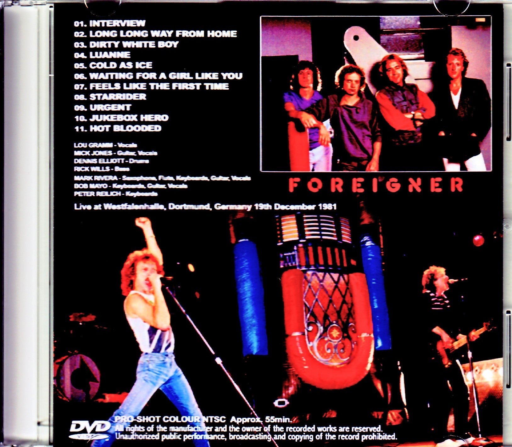 1. Interview 2. Long Long Way from Home 3. Dirty White Boy 4. Luanne 5. Cold As Ice 6. Waiting For A Girl Like You 7. Feels Like The First Time 8. Starrider 9. Urgent 10. Jukebox Hero 11. Hot Blooded Lou Gramm - Vocals Mick Jones - Guitar, Vocals Dennis Elliott - Drums Rick Wills - Bass Mark Rivera - Saxophone, Flute, Keyboards, Guitar, Vocals Bob Mayo - Keyboards, Guitar, Vocals Peter Reilich - Keyboards PRO-SHOT COLOR NTSC Approx .55min.