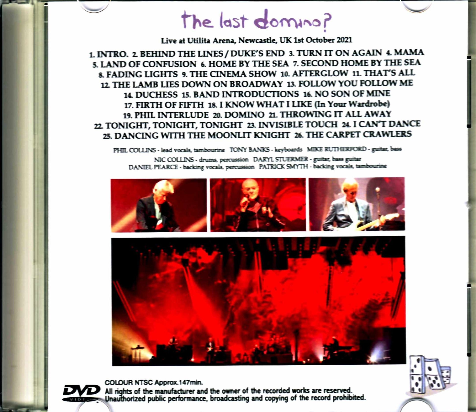 1. Behind the Lines / Duke's End 2. Turn It On Again 3. Mama 4. Land of Confusion 5. Home by the Sea 6. Second Home by the Sea 7. Fading Lights 8. The Cinema Show 9. Afterglow 10. That's All 11. The Lamb Lies Down on Broadway 12. Follow You Follow Me 13. Duchess 14. Band introductions 15. No Son of Mine 16. Firth of Fifth 17. I Know What I Like (In Your Wardrobe) 18. Domino 19. Throwing It All Away 20. Tonight, Tonight, Tonight 21. Invisible Touch 22. I Can't Dance 23. Dancing With the Moonlit Knight 24. The Carpet Crawlers Phil Collins - lead vocals, tambourine Tony Banks - keyboards Mike Rutherford - guitar, bass guitar, bass pedals Nic Collins - drums, percussion Daryl Stuermer - guitar, bass guitar Daniel Pearce - backing vocals, percussion Patrick Smyth - backing vocals, tambourine COLOUR NTSC Approx.147min.