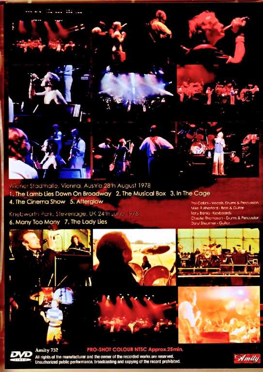 Wiener Stadthalle, Vienna, Austria 28th August 1978 PRO-SHOT 1. The Lamb Lies Down On Broadway 2. The Musical Box 3. In The Cage 4. The Cinema Show 5. Afterglow Knebworth Park, Stevenage, UK 24th June 1978 6. Many Too Many 7. The Lady Lies Phil Collins - Vocals, Drums & Percussion Mike Rutherford - Bass & Guitar Tony Banks - Keyboards Chester Thompson - Drums & Percussion Daryl Steurmer - Guitar PRO-SHOT COLOUR NTSC Approx.25min.