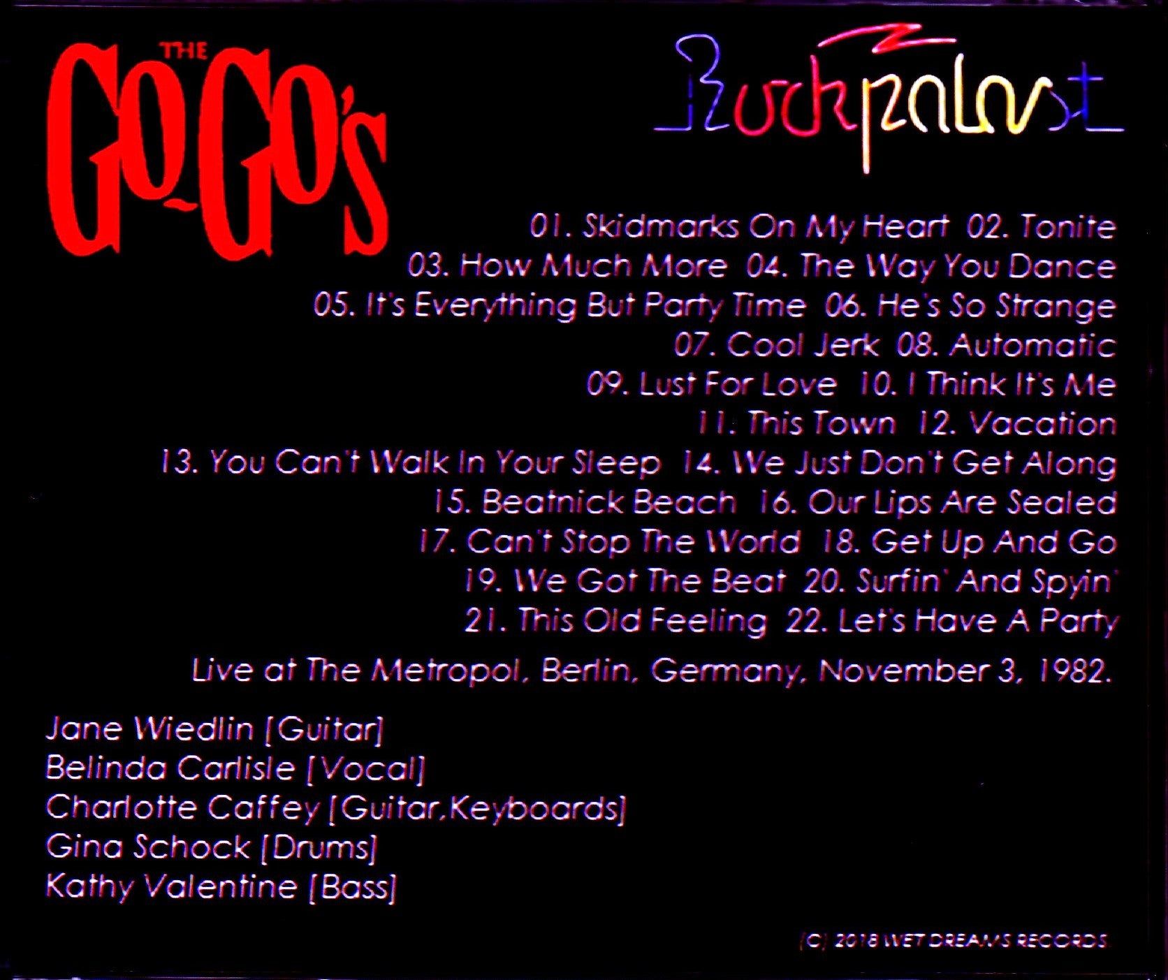 01. Skidmarks On My Heart / 02. Tonite / 03. How Much More / 04. The Way You Dance / 05. It's Everything But Party Time /06. He's So Strange / 07. Cool Jerk / 08. Automatic / 09. Lust For Love / 10. I Think It's Me / 11. This Town / 12. Vacation / 13. You Can't Walk In Your Sleep / 14. We Just Don't Get Along / 15. Beatnick Beach / 16. Our Lips Are Sealed / 17. Can't Stop The World / 18. Get Up And Go / 19. We Got The Beat / 20. Surfin' And Spyin' / 21. This Old Feeling / 22. Let's Have A Party [Rockpalast Live : at Metropol, Berlin, Germany, November 3rd 1982 : stereo soundboard recording] Belinda Carlisle - lead vocals / Charlotte Caffey - lead guitar, vocals / Jane Wiedlin - rhythm guitar, vocals / Kathy Valentine - bass guitar, vocals / Gina Schock - drums, percussion , vocals