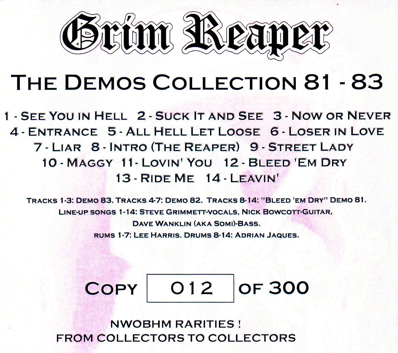 Formed in 1979, GRIM REAPER cannot be overlooked when talking about NWOBHM. The orthodox metal sound was fused with Steve Grimmett's unique high-tone shouts known as "Grimmett-bushi," and the stunning GRIM REAPER sound captured the hearts of many metal fans. This title is a combination of the studio demo before the release of the first album in 1983. It's fun to see the sound change little by little from the 1981 demo mix to 1982 and 1983, probably due to the trends of the times. Above all, I am amazed at the high quality of the songs even back then. It sounds very clear, probably because it's a remaster. Of course, you can enjoy a completely different take from the album, and Steve Grimmett's voice is younger, so be sure to check it out! A great collector's CD that is a must-have for enthusiasts, containing a total of 14 songs, including the 1st demo from '81 before Teve Grimmett (Vo.) joined (there is a mistake in the credits on the back side lineup), and the demos from '82 and '83 after he joined! See you in Hell Suck it and See Now or Never Entrance All Hell Let Loose Loser in Love Lair Intro Street Lady Maggy Lovin' You Bleed 'Em Dry Ride Me Leavin'