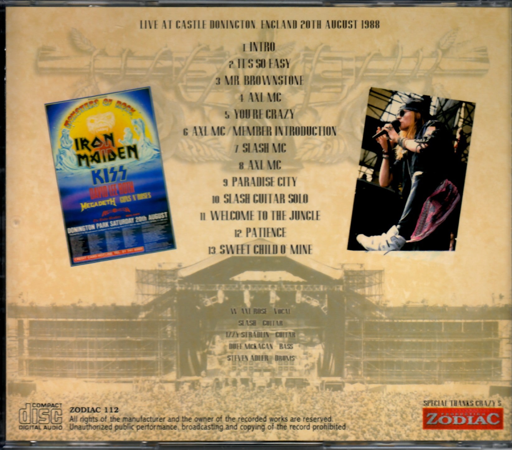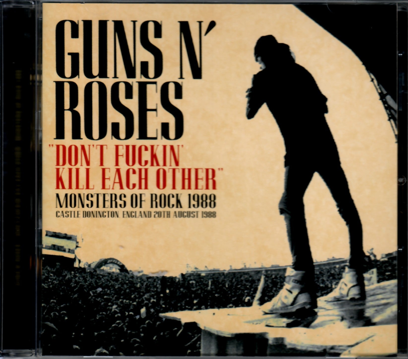 Even if there are hundreds or thousands of recordings of GUNS N' ROSES, if it becomes a "special among specials", this one is the only one. Yes, the tragic “MONSTERS OF ROCK 1988” that left two people dead has been revived on CD! GUNS N' ROSES first appeared on stage at the sacred Donington in 1988, when they were sweeping the world as the darlings of their time. Although they made a shocking debut that turned the music industry upside down, they are still in their short careers and will be the second performers. However, a fatal accident occurred that changed even the history of the prestigious "MONSTERS OF ROCK". There have been recordings of this show since then, but all of them had poor sound quality. What changed the situation completely was "Don't Fuckin' Kill Each Other," recorded by Crazy S. and released on the LANGLEY label in 2002. Enthusiasts around the world were shocked by the clear sound and uncut recording. It was a memorable piece that announced to the world that ``Super Taper ``Crazy.S'' is here!'' and marked the beginning of the company's meteoric rise. In fact, even if I listen to it with my current ears who know a lot of Crazy.S's recordings, the sound of this work is amazing. Mr. Crazy.S also recorded IRON MAIDEN, which decorated the night of this day, and in "MONSTERS OF ROCK 1988: 25th Anniversary Edition" using that sound source and sound board sound source, ``It feels strange even when mixed with the sound board sound source. There's nothing like it!'' However, this work even surpasses that IRON MAIDEN edition! This work is one of the most amazingly high-quality songs in the master Crazy.S collection, and has been further refined with the latest digital remastering. Although the original sound source always remained high quality, the nuances of the sound were changing rapidly. However, in this work, the excessive points from the low range to the mid range have been adjusted to improve the sense of separation between each instrument. For example, if you listen to "It's So Easy," you'll notice that the prominent high notes have become more natural, making it much easier to listen to. And the reason why this work is “special among specials” is the content of the live performance. In the PV for "Paradise City," you can see the large crowd at Donnington, which resembles a pulsating ocean, and that is exactly the scene of this work. A strange atmosphere wafts from the opening, and the first song "It's So Easy" begins. Yes, this one song is exactly the moment when two people were crushed to death. The audience was so excited that they didn't even realize that someone had died during the performance, and they started the second song. However, at this point, the band probably felt like, ``This is going to be crazy...'' and couldn't move on to the next song. Axl Rose and Slash both called on the audience to calm down, and a number of ferocious MCs such as "Hey, stand back, stand back!", "Calm down!", "Don't kill each other!", "Get out!", etc. I can hear it clearly (I'm really glad Mr. Crazy.S is safe...). Even with such an MC here and there, the performance is truly wonderful. Even though it feels dangerous, the awesomeness of GUNS N' ROSES, which is taking the world by storm, overflows even when I try to suppress it. If they were to suddenly leave the stage, it would be a riot, but that doesn't mean it would be impossible to listen to a live performance like this and be told to calm down... In order to calm the audience, it is said that the set list was suddenly rearranged on this day, and even at the end of the show, which would have been played up, the slow songs "Patience" and "Sweet Child O' Mine" were brought in. At the end of “Sweet Child O’ Mine,” which sounds like a requiem, the album ends with the words “Great fuckin’ day!!” that are neither ironic nor desperate. “MONSTERS OF ROCK”, which resulted in many deaths, was canceled the following year in 1989 for the first time in history, and it was 18 years later in 2006 that GUNS N' ROSES returned to the sacred place of Donington. GUNS N' ROSES continues to produce many anecdotes after this, but among them, the 46 minutes included in this work is a super big incident. This is a vacuum-packed album that captures the whole story of a tragedy that no one expected, with the clearest, most realistic super sound. A live album? No, this is a document album that turns your shelf into a historical archive. Live at Castle Donington, England 20th August 1988 TRULY PERFECT SOUND(from Original Masters)(45:53) 1. Intro. 2. It's So Easy 3. Mr. Brownstone 4. Axl MC 5. You're Crazy 6. Axl MC / Member Introduction 7. Slash MC 8. Axl MC 9. Paradise City 10. Slash Guitar Solo 11. Welcome To The Jungle 12. Patience 13. Sweet Child O' Mine W. Axl Rose - Vocal Slash - Guitar Izzy Stradlin - Guitar Duff McKagan – Bass Steven Adler – Drums