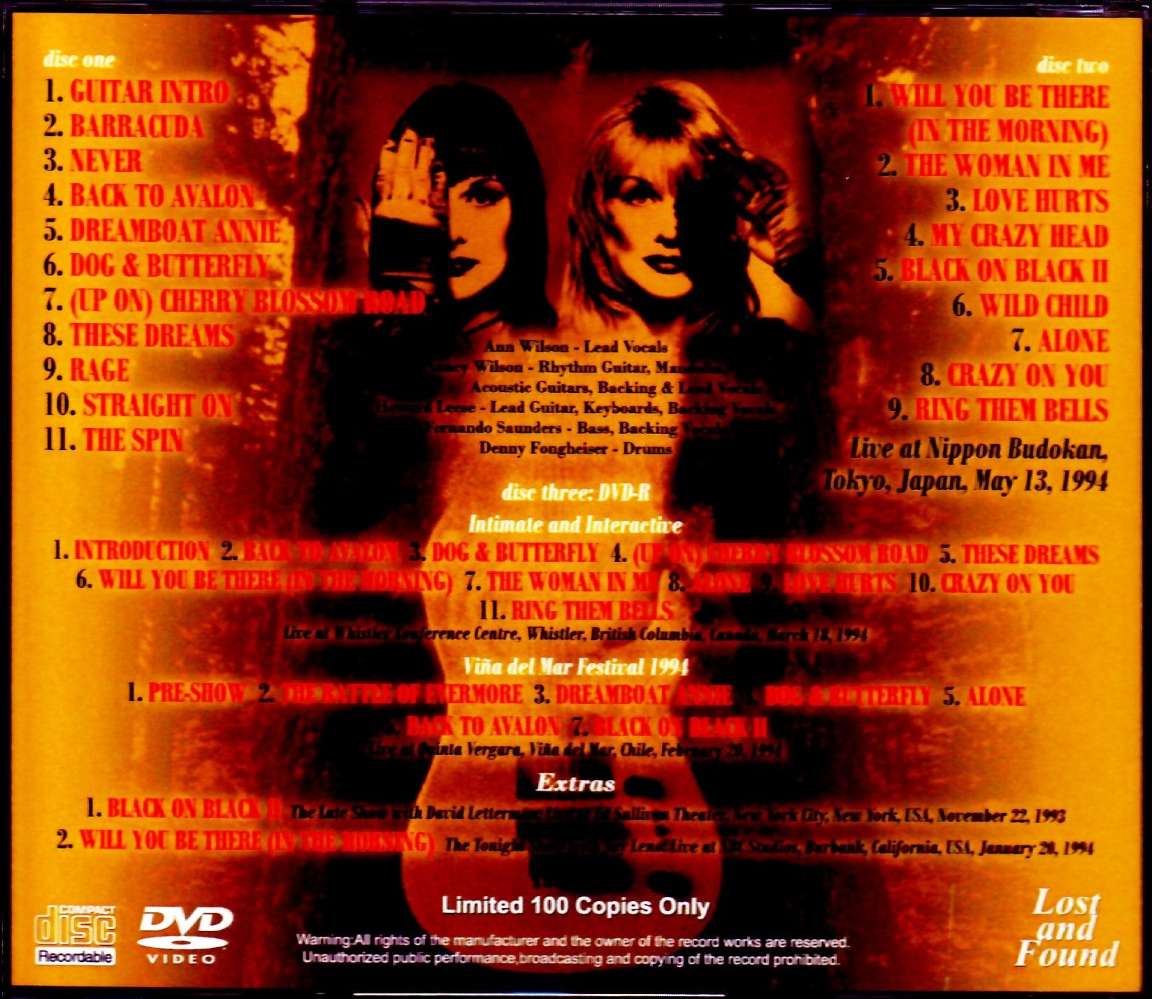 disc one 01. GUITAR INTRO 02. BARRACUDA 03. NEVER 04. BACK TO AVALON 05. DREAMBOAT ANNIE 06. DOG & BUTTERFLY 07. (UP ON) CHERRY BLOSSOM ROAD 08. THESE DREAMS 09. RAGE 10. STRAIGHT ON 11. THE SPIN disc two 01. WILL YOU BE THERE (IN THE MORNING) 02. THE WOMAN IN ME 03. LOVE HURTS 04. MY CRAZY HEAD 05. BLACK ON BLACK II 06. WILD CHILD 07. ALONE 08. CRAZY ON YOU 09. RING THEM BELLS disc three: DVD *Intimate and Interactive 01. INTRODUCTION 02. BACK TO AVALON 03. DOG & BUTTERFLY 04. (UP ON) CHERRY BLOSSOM ROAD 05. THESE DREAMS 06. WILL YOU BE THERE (IN THE MORNING) 07. THE WOMAN IN ME 08. ALONE 09. LOVE HURTS 10. CRAZY ON YOU 11. RING THEM BELLS Live at Whistler Conference Centre, Whistler, British Columbia, Canada, March 18, 1994 *Viña del Mar Festival 1994 01. PRE-SHOW 02. THE BATTLE OF EVERMORE 03. DREAMBOAT ANNIE 04. DOG & BUTTERFLY 05. ALONE 06. BACK TO AVALON 07. BLACK ON BLACK II Live at Quinta Vergara, Viña del Mar, Chile, February 20, 1994 *Extras 08. BLACK ON BLACK II The Late Show with David Letterman:Live at Ed Sullivan Theater, New York City, New York, USA, November 22, 1993 02. WILL YOU BE THERE (IN THE MORNING) The Tonight Show with Jay Leno:Live at NBC Studios, Burbank, California, USA, January 20, 1994