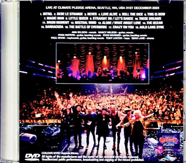 Climate Pledge Arena, Seattle, WA, USA 31st December 2023 AMAZING SHOT!!! 1. Intro 2. Bebe Le Strange 3. Never 4. Love Alive 5. Roll The Dice 6. This Is Now 7. Magic Man 8. Little Queen 9. Straight On / Let's Dance 10. These Dreams 11. Drum Moment 12. Mistral Wind 13. Alone / What About Love 14. The Ocean 15. Barracuda 16. The Battle Of Evermore 17. Crazy On You 18. Auld Lang Syne COLOUR NTSC Approx.93min.