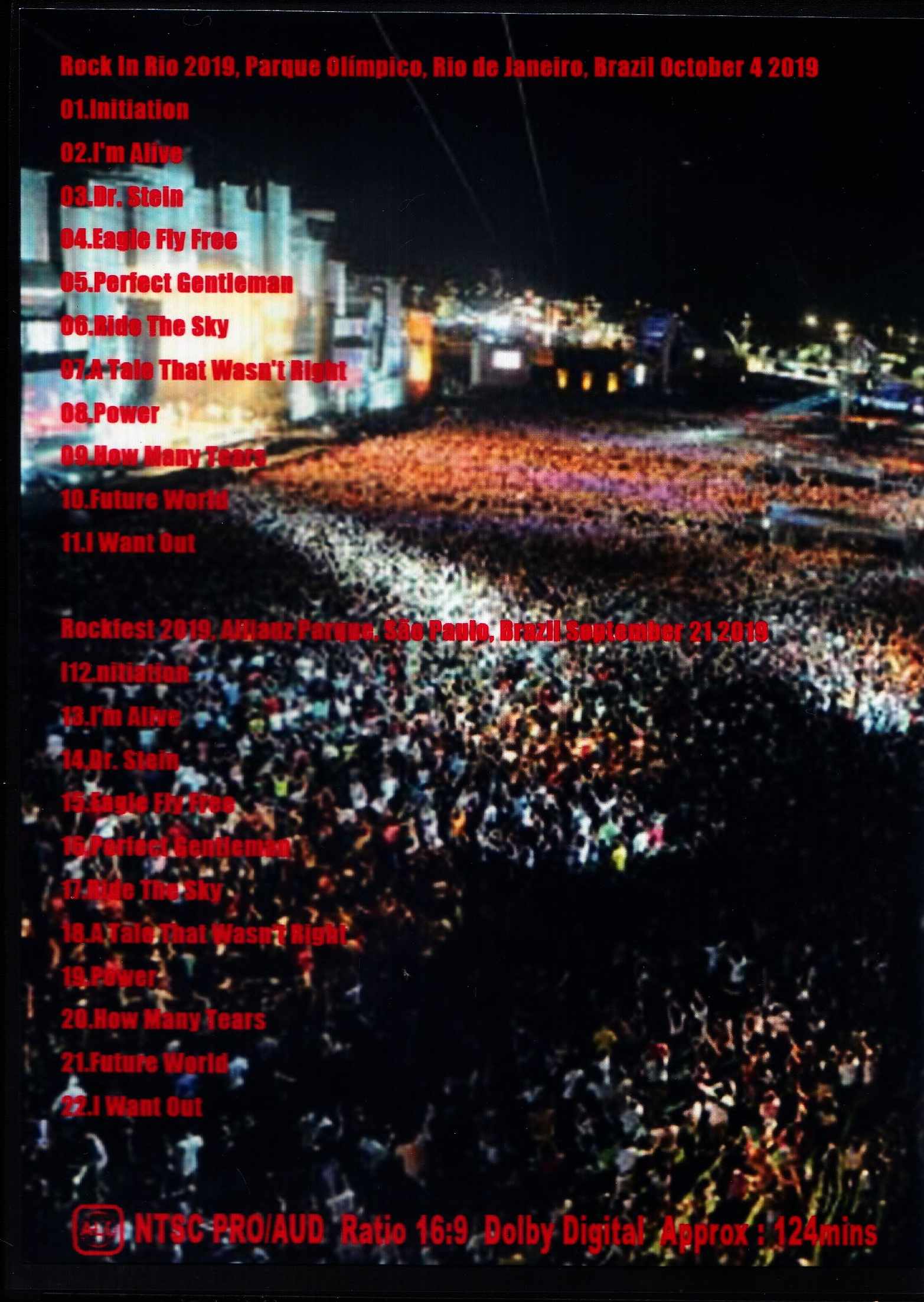 01.Initiation/02.I'm Alive/03.Dr. Stein/04.Eagle Fly Free/05.Perfect Gentleman/06.Ride The Sky/ 07.A Tale That Wasn't Right/08.Power/09. How Many Tears/10.Future World/11.I Want Out Rockfest 2019, Allianz Parque, So Paulo, Brazil September 21 2019 01.Initiation/02.I'm Alive/03.Dr. Stein/04.Eagle Fly Free/ 05.Perfect Gentleman/06.Ride The Sky/ 07.A Tale That Wasn't Right/08.Power/09.How Many Tears/10.Future World/11.I Want Out (124 minutes)