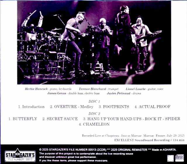 Recorded Live at Chapiteau, Jazz in Marciac, Marciac, France, July 29, 2025 EXCELLENT Soundboard Recording // 114 min DISC 1 1. Introduction 2. OVERTURE - Medley 3. FOOTPRINTS 4. ACTUAL PROOF DISC 2 1. BUTTERFLY 2. SECRET SAUCE 3. HANG UP YOUR HAND UPS - ROCK IT - SPIDER 4. CHAMELEON Herbie Hancock - piano, keyboards Terence Blanchard - trumpet Lionel Loueke - guitar, voice James Genus - double bass, electric bass Jaylen Petinaud - drums