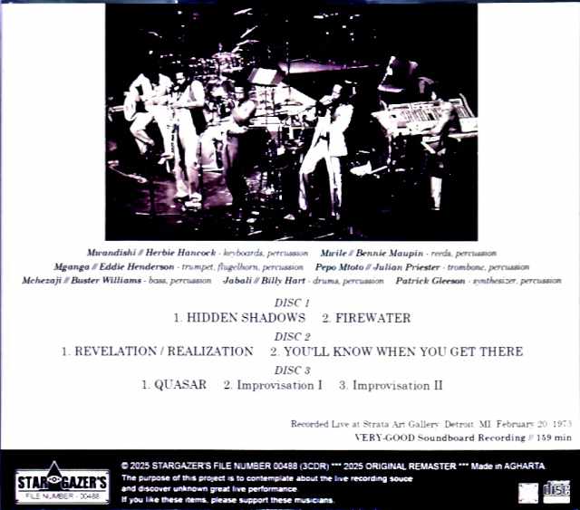 Recorded Live at Strata Art Gallery, Detroit, MI, February 20, 1973 VERY-GOOD Soundboard Recording // 159 min DISC 1 1. HIDDEN SHADOWS 2. FIREWATER DISC 2 1. REVELATION / REALIZATION 2. YOU'LL KNOW WHEN YOU GET THERE DISC 3 1. QUASAR 2. Improvisation I 3. Improvisation II Mwandishi // Herbie Hancock - keyboards, percussion Mwile // Bennie Maupin - reeds, percussion Mganga // Eddie Henderson - trumpet, flugelhorn, percussion Pepo Mtoto // Julian Priester - trombone, percussion Mchezaji // Buster Williams - bass, percussion Jabali // Billy Hart - drums, percussion Patrick Gleeson - synthesizer, percussion