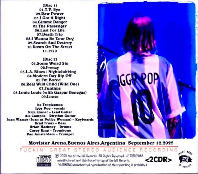 Movistar Arena,Buenos Aires,Argentina September 12,2025 (Disc 1) 01.T.V. Eye 02.Raw Power 03.I Got A Right 04.Gimme Danger 05.The Passenger 06.Lust For Life 07.Death Trip 08.I Wanna Be Your Dog 09.Search And Destroy 10.Down On The Street 11.1970 (Disc 2) 01.Some Weird Sin 02.Frenzy 03.L.A. Blues / Nightclubbing 04.Modern Day Rip Off 05.I'm Bored 06.Real Wild Child (Wild One) 07.Funtime 08.Louie Louie (with Gaspar Benegas) 09.Loose The Tropicanos: Iggy Pop - vocals Nick Zinner – Lead Guitar Ale Campos – Rhythm Guitar Joan Wasser (Joan as Police Woman) – Keyboards Brad Truax – Bass Urian Hackney – Drums Corey King – Trombone Pan Amsterdam – Trumpet