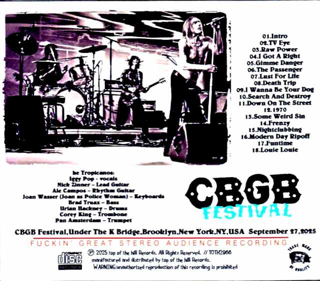 CBGB Festival,Under The K Bridge,Brooklyn,New York,NY,USA September 27,2025 01.Intro02.TV Eye 03.Raw Power 04.I Got A Right 05.Gimme Danger 06.The Passenger 07.Lust For Life 08.Death Trip 09.I Wanna Be Your Dog 10.Search And Destroy 11.Down On The Street 12.1970 13.Some Weird Sin 14.Frenzy 15.Nightclubbing 16.Modern Day Ripoff 17.Funtime 18.Louie Louie The Tropicanos: Iggy Pop - vocals Nick Zinner – Lead Guitar Ale Campos – Rhythm Guitar Joan Wasser (Joan as Police Woman) – Keyboards Brad Truax – Bass Urian Hackney – Drums Corey King – Trombone Pan Amsterdam – Trumpet