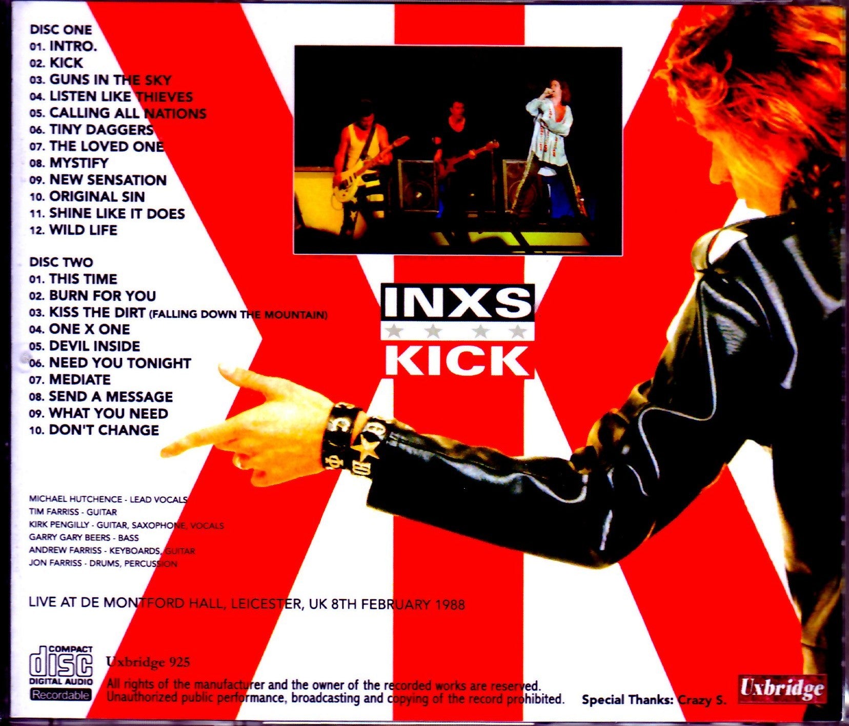 INXS rose to become the darling of the era in 1988 with their famous album "KICK". The super best original recording is now available. What is engraved in this work is “February 8, 1988 Leicester performance”. This is a transcendent audience album. Speaking of 1988, it was a great time when they even came to Japan. First of all, let's check the show's position from the whole story of the world tour that trampled the world with the famous album. 1987, August 14th-29th: Australia (9 performances), September 13th: Norfolk performance [KICK released on October 12th], October 16th-November 23rd: North America #1 (27th) Performances)・December 2nd-14th: UK (10 performances) 1988・February 5th-26th: Europe #1 (15 performances)←★Here★・March 1st-31st: North America #2 (22 performances) ・May 18th - June 18th: North America #3 (23 performances) ・June 22nd - July 11th: Europe #2 (12 performances) ・August 3rd - September 25th : North America #4 (36 performances) October 1st-10th: Japan (7 performances) October 14th-November 13th: Oceania (19 performances) This is the overall picture of the climax tour. The UK performance of “KICK TOUR” started in 1987, but it restarted in February 1988 after the year-end and New Year holidays. The Leicester performance of this work was the third concert of “Europe #1” which decorates the beginning. This work, which contains such a show, is a tremendous audience recording that makes you want to line up two or three “super” songs. It is made into a CD directly from the original cassette given by the recording artist himself, and the recording artist himself is the master master "Crazy S.". He is a world-famous artist who produced many masterpieces throughout the 1980s, but his heyday came from 1986 to 1988. “Crazy S.”’s works over the past three years have been a series of divinely high-quality sound. This work is a transcendental recording that is the peak of such a master craftsman. In fact, the sound of this work is strange. Since it is the master of the person who recorded it, there is no doubt that it is an audience recording, but the extremely on core is forever powerful, and the detailed details are like a sound board. If you can't feel the distance, there's no cloudiness or turbidity, and it's a wonderful sound that you would believe if you were told, "It's an FM broadcast with real cheers." The show drawn with such transcendent quality is also the pinnacle. After all, this is the scene where an extraordinary "KICK" whirlwind has just begun to rage. In the set, all songs from ``KICK'' except for ``Never Tear Us Apart'' will be played on a large scale, and past repertoire will be interspersed with it. Even among past songs, there are many hit singles such as ``SHABOOH SHOOBAH'', ``THE SWING'', and ``LISTEN LIKE THIEVES''. In fact, out of the 21 songs in this album, the only songs that are not new or singles are "Shine Like It Does" and "One X One." Of course, they also perform "I Send A Message", which had a huge impact on the temple PV (I can still picture the line of monks slowly walking to the beat...). It is truly a “live performance version of KICK + α” show, but the on-site feeling of this work is far from that. The potential of the band that created the great album is fueled by the wind of the big hit, and the band's potential explodes into a frenzy. And the enthusiasm that witnessed the performance was amazing. I would like to remind you that the main characters of this work are the very close performance sound and the late Michael Hutchence's singing voice, and it does not waver even one millimeter. However, beyond that loud sound, a vast yellow enthusiasm spreads out. As soon as the super-thick performance stopped and the MC started, tearing voices flew from everywhere, and the chorus singing the chorus of the hit song was loud (albeit small). Buoyed by that enthusiasm, hit songs were performed with even more heated performances... This synergistic effect is truly at its peak and climax. It is full of the power of the goddess' smile that many artists/bands can experience once in their lives. INXS is at its peak, and “Crazy S.” is in the midst of its heyday. This is a masterpiece that was made possible because both the band and the recording artist believed in it. A live album where you can experience the "real 100% version of KICK" with ultra-high quality sound that is typical of a sound board, while feeling the ultra-realistic excitement of climax that would not be possible with a sound board. This is a cultural heritage of rock history that is no longer just a ``good show with good sound''. Live at De Montford Hall, Leicester, UK 8th February 1988 TRULY PERFECT SOUND(from Original Masters) Disc 1(41:45) 1. Intro 2. Kick 3. Guns In The Sky 4. Listen Like Thieves 5. Calling All Nations 6 . Tiny Daggers 7. The Loved One 8. Mystify 9. New Sensation 10. Original Sin 11. Shine Like It Does 12. Wild Life Disc 2(43:57) 1. This Time 2. Burn For You 3. Kiss The Dirt (Falling Down The Mountain) 4. One X One 5. Devil Inside 6. Need You Tonight 7. Mediate 8. Send A Message 9. What You Need 10. Don't Change Michael Hutchence - lead vocals Tim Farriss - guitar Kirk Pengilly - guitar, saxophone, vocals Garry Gary Beers - bass Andrew Farriss - keyboards, guitar Jon Farriss - drums, percussion