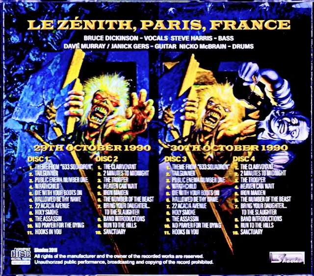 Le Zenith, Paris, France 29th & 30th October 1990 TRULY PERFECT SOUND UPGRADE Le Zenith, Paris, France 29th October 1990 Disc 1 (50:54) 1. Theme From “633 Squadron” 2. Tailgunner 3. Public Enema Number One 4. Wrathchild 5. Die With Your Boots On 6. Hallowed Be Thy Name 7. 22 Acacia Avenue 8. Holy Smoke 9. The Assassin 10. No Prayer For The Dying 11. Hooks In You Disc 2 (55:16) 1. The Clairvoyant 2. 2 Minutes To Midnight 3. The Trooper 4. Heaven Can Wait 5. Iron Maiden 6. The Number Of The Beast 7. Bring Your Daughter... To The Slaughter 8. Band Introductions 9. Run To The Hills 10. Sanctuary Le Zenith, Paris, France 30th October 1990 Disc 3 (51:40) 1. Theme From “633 Squadron” 2. Tailgunner 3. Public Enema Number One 4. Wrathchild 5. Die With Your Boots On 6. Hallowed Be Thy Name 7. 22 Acacia Avenue 8. Holy Smoke 9. The Assassin 10. No Prayer For The Dying 11. Hooks In You Disc 4 (53:20) 1. The Clairvoyant 2. 2 Minutes To Midnight 3. The Trooper 4. Heaven Can Wait 5. Iron Maiden 6. The Number Of The Beast 7. Bring Your Daughter... To The Slaughter 8. Band Introductions 9. Run To The Hills 10. Sanctuary Bruce Dickinson - Vocals Steve Harris - Bass Dave Murray - Guitar Janick Gers - Guitar Nicko McBrain - Drums