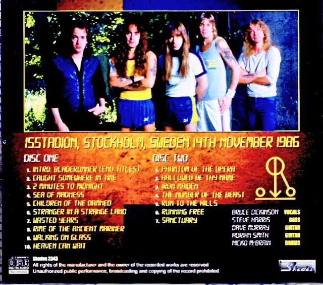 Isstadion, Stockholm, Sweden 14th November 1986 TRULY PERFECT SOUND Disc:1 (63:32) 1. Intro: Bladerunner (End Titles) 2. Caught Somewhere In Time 3. 2 Minutes To Midnight 4. Sea Of Madness 5. Children Of The Damned 6. Stranger In A Strange Land 7. Wasted Years 8. Rime Of The Ancient Mariner 9. Walking On Glass 10. Heaven Can Wait Disc:2 (45:44) 1. Phantom Of The Opera 2. Hallowed Be Thy Name 3. Iron Maiden 4. The Number Of The Beast 5. Run To The Hills 6. Running Free 7. Sanctuary