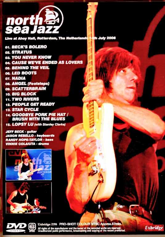 NORTH SEA JAZZ 2006 : at Ahoy Hall, Rotterdam, The Netherlands 14th July 2006 : PRO-SHOT COLOUR NTSC Approx.67min 1. Beck's Bolero 2. Stratus 3. You Never Know 4. Cause We've Ended As Lovers 5. Behind The Veil 6. Led Boots 7. Nadia 8. Angel (Footsteps) 9. Scatterbrain 10. Big Block 11. Two Rivers 12. People Get Ready 13. Star Cycle 14. Goodbye Pork Pie Hat/Brush With The Blues 15. Lopsy Lu (with Stanley Clarke) Jeff Beck – guitar / Jason Rebello – keyboards / Randy Hope-Taylor – bass / Vinnie Colaiuta - drums
