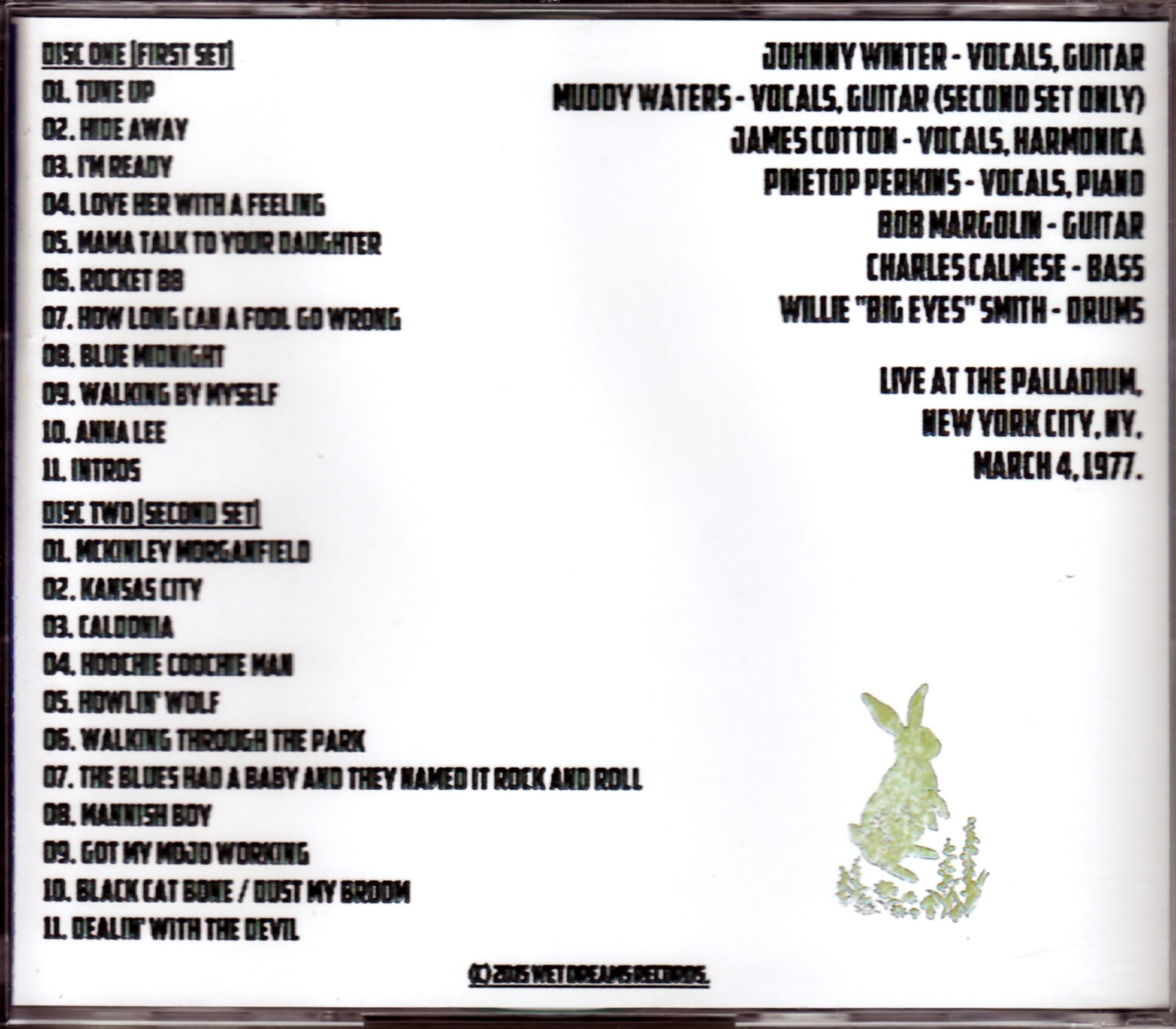 DISC ONE : (FIRST SET) 01. Tune up / 02. Hide Away / 03. I'm Ready / 04. Love Her With A Feeling05. Mama Talk To Your Daughter 06. Rocket 88 / 07. How Long Can A Fool Go Wrong / 08. Blue Midnight / 09. Walking By Myself / 10. Anna Lee / 11. Intros DISC TWO : (SECOND SET) 01. McKinley Morganfield / 02. Kansas City / 03. Caldonia / 04. Hoochie Coochie Man / 05. Howlin' Wolf / 06. Walking Through The Park / 07. The Blues Had A Baby And They Named It Rock And Roll / 08. Mannish Boy / 09. Got My Mojo Working / 10. Black Cat Bone / Dust My Broom / 11. Dealin' With The Devil [An Evening Of The Blues : at The Palladium, NYC, NY, USA, March 4th 1977 : soundboard recording] Johnny Winter (Vocal, Guitar) / Muddy Waters (Vocal, Guitar) / James Cotton ( Harp, Vocal) / Joe "Pinetop" Perkins (Piano) / Bob Margolin (Guitar) / Charles Calmese (Bass) / Willie Smith (Drums)