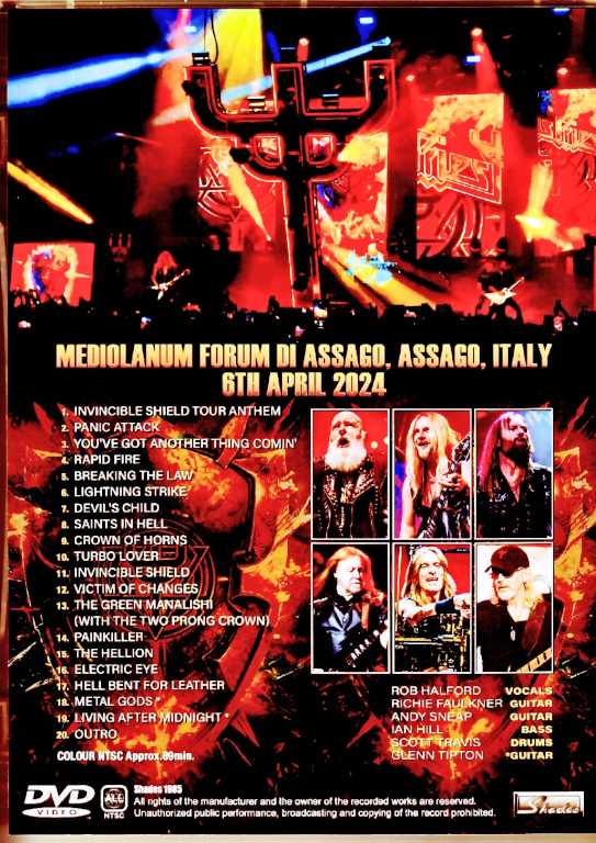Mediolanum Forum di Assago, Assago, Italy 6th April 2024 AMAZING SHOT!!! 1. Invincible Shield Tour Anthem 2. Panic Attack 3. You've Got Another Thing Comin' 4. Rapid Fire 5. Breaking The Law 6. Lightning Strike 7. Devil's Child 8. Saints In Hell 9. Crown Of Horns 10. Turbo Lover11. Invincible Shield 12. Victim Of Changes 13. The Green Manalishi (With The Two Prong Crown) 14. Painkiller 15. The Hellion 16. Electric Eye 17. Hell Bent For Leather 18. Metal Gods * 19. Living After Midnight * 20. Outro Rob Halford – Vocals Richie Faulkner – Guitar Andy Sneap – Guitar Ian Hill – Bass Scott Travis – Drums Glenn Tipton – Guitar * COLOUR NTSC Approx.93min.
