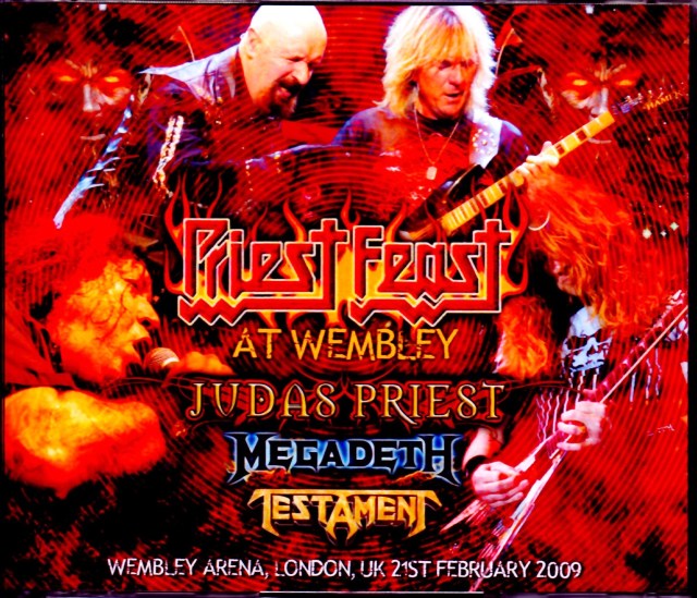 This is a complete recording of the February 21st Wembley Arena performance in London from "PRIEST FEAST" by Judas, Megadeth, and Testament, which was held twice in Ireland and seven times in the UK in 2009. The sound quality is perfect, using the original DAT master directly. The first Testament is a 42-minute recording, with S.E. not included, but recorded from Over The Wall. The set, which was well-selected from each album, including the just-released "The Formation of Damnation," was wonderful, and it was clear that they overwhelmed the audience with their core performance. Next, Megadeth performed a stage of about 62 minutes, which was slightly shorter than their regular show, but it was an attractive set that any fan would enjoy, from the 2007 release "United Abominations" number to their classic songs. The sound quality is also excellent, Mustaine's vocals are recorded very clearly, and what's amazing is that after the heavy excitement of In My Darkest Hour in the second half, the killer tunes Symphony Of Destruction, Skin O' My Teeth, Hangar 18, and Peace Sells are a masterpiece. And Judas Priest is a 1 hour 44 minute stage, also recorded with soundboard level quality. The performance that can be heard with super sound is truly impressive, and the powerful and Gigantic performance and the great power of Rob's shout are goosebumps. There is also a rare counting mistake in You've Got Another Thing Comin'. A must-have for metal fans. (Live at Wembley Arena, London, UK 21st February 2009) (Disc 1: TESTAMENT) 1. Over The Wall 2. New Order 3. Souls Of Black 4. More Than Meets The Eye 5. D.N.R. (Do Not Resuscitate) 6. Three Days In Darkness 7. Practice What You Preach 8. The Formation Of Damnation Chuck Billy - Vocals / Eric Peterson - Guitar / Alex Skolnick – Gu itar / Greg Christian – Bass / Paul Bostaph – Drums (Disc 2: MEGADETH) 1. Sleepwalker 2. Wake Up Dead 3. Take No Prisoners 4. A Tout Le Monde 5. Washington Is Next 6. She-Wolf 7. In My Darkest Hour 8. Symphony Of Destruction 9. Skin O' My Teeth 10. Hangar 18 11. Peace Sells 12. Holy Wars Dave Mustaine - Guitar & Vocal / Chris Broderick - Guitar & Vocal / James Lomenzo - Bass & Vocal / Shawn Drover - Drums (Disc 3: JUDAS PRIEST) 1. Dawn Of Creation 2. Prophecy 3. Metal Gods 4. Eat Me Alive 5. Between The Hammer And The Anvil 6. Devil's Child 7. Breaking The Law 8. Hell Patrol 9. Death Patrol 10. Dissident Aggressor 11. Angel 12. The Hellion / Electric Eye 13. Rock Hard Ride Free (Disc 4: JUDAS PRIEST) 1. Sinner 2. Painkiller 3. Hell Bent For Leather 4. The Green Manalishi 5. Yeah Yeah Yeah 6. You've Got Another Thing Comin' Rob Halford - Vocals / K.K Downing – Guitar / Glenn Tipton – Guitar / Ian Hill – Bass / Scott Travis – Drums
