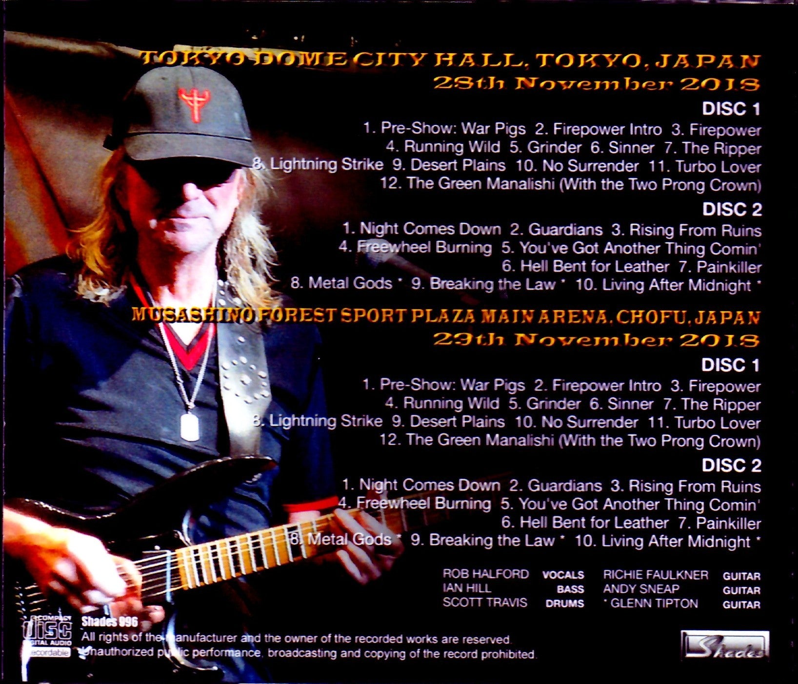 Disc 1 : 1. Pre-Show: War Pigs 2. Firepower Intro 3. Firepower 4. Running Wild 5. Grinder 6. Sinner 7. The Ripper 8. Lightning Strike 9. Desert Plains 10. No Surrender 11. Turbo Lover 12. The Green 10. Living After MidnightManalishi (With the Two Prong Crown) Disc 2 : 1. Night Comes Down 2. Guardians 3. Rising From Ruins 4. Freewheel Burning 5. You've Got Another Thing Comin' 6. Hell Bent for Leather 7. Painkiller 8. Metal Gods 9. Breaking the Law 10. Living After Midnight [Live at Tokyo Dome City Hall, Tokyo, Japan 28th November 2018] Disc 3 : 1. Pre-Show: War Pigs 2. Firepower Intro 3. Firepower 4. Running Wild 5. Grinder 6. Sinner 7. The Ripper 8. Lightning Strike 9. Desert Plains 10. No Surrender 11. Turbo Lover 12. The Green Manalishi (With the Two Prong Crown) Disc 4 : 1. Night Comes Down 2. Guardians 3. Rising From Ruins 4. Freewheel Burning 5. You've Got Another Thing Comin' 6. Hell Bent for Leather 7. Painkiller 8. Metal Gods 9. Breaking the Law [Live at Musashino Forest Sport Plaza Main Arena, Chofu, Japan 29th November 2018] Rob Halford - Vocals / Richie Faulkner - Guitar / Andy Sneap - Guitar, Vocals / Ian Hill – Bass / Scott Travis - Drums / Glenn Tipton - Guitar (on Encore Tracks)