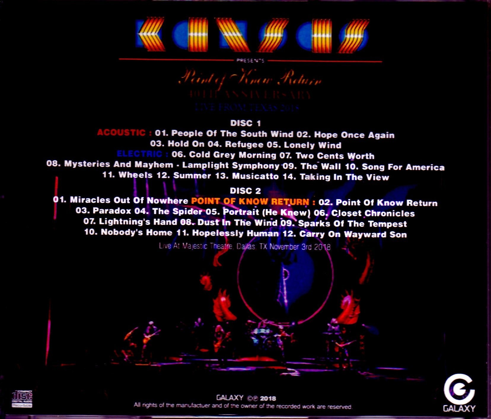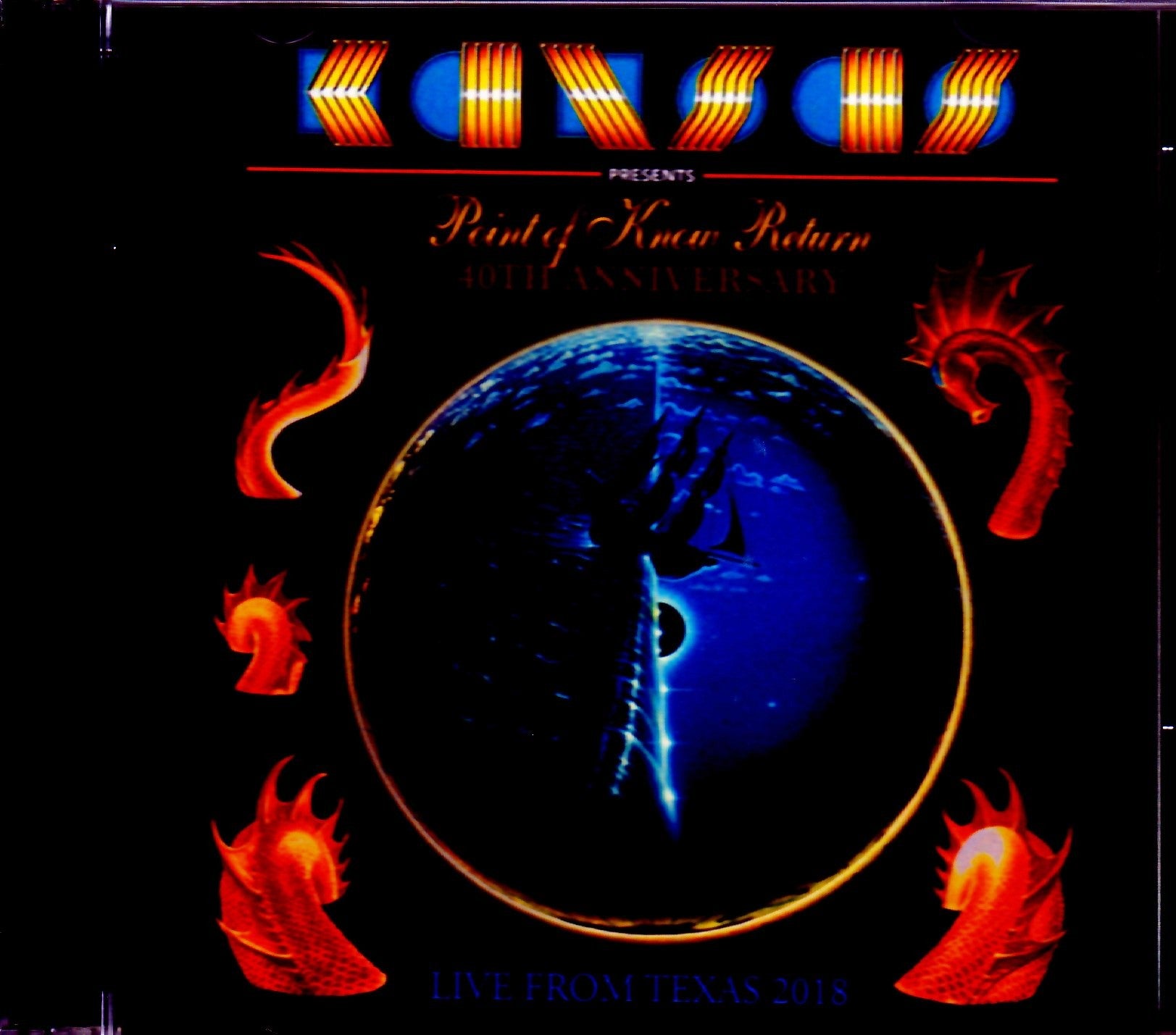 The Dallas, Texas show was held on November 3, 2018 as part of the 40th anniversary tour of Kansas' masterpiece ``Point of No Return'', which was active in the 70's as an American progressive band. Introducing a complete 2-disc set of high-quality audience recording masters! The concert started with an acoustic set, followed by an electric set, and in the second half, they performed a reenactment of all the songs from the famous album ``Point of No Return''. The last performance was the hit song "Carry On Wayward Son". First appearance of the latest Kansas 2018 live show that brings tears of joy to past fans! ! DISC 1 ACOUSTIC: 01. People Of The South Wind 02. Hope Once Again 03. Hold On 04. Refugee 05. Lonely Wind ELECTRIC: 06. Cold Gray Morning 07. Two Cents Worth 08. Mysteries And Mayhem - Lamplight Symphony 09. The Wall 10. Song For America 11. Wheels 12. Summer 13. Musicatto 14. Taking In The View DISC 2 01. Miracles Out Of Nowhere POINT OF KNOW RETURN: 02. Point Of Know Return 03. Paradox 04. The Spider 05. Portrait (He Knew) 06. Closet Chronicles 07. Lightning's Hand 08. Dust In The Wind 09. Sparks Of The Tempest 10. Nobody's Home 11. Hopelessly Human 12. Carry On Wayward Son Live At Majestic Theatre, Dallas, TX November 3rd 2018