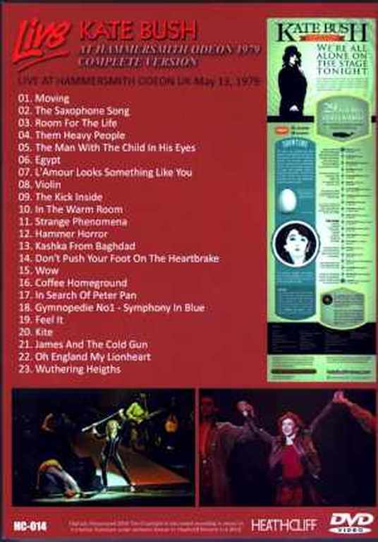 In 2014, Kate Bush surprised her fans by suddenly announcing a tour, but up until that point her only tour had been in Europe in 1979. The 1979 tour entitled TOUR OF LIFE became a hot topic for its theatrical production, and later the Hammersmith Odeon performance from the same tour was released as a video work. However, it has not yet been released on DVD or Blu-ray, and even when it was released, only about half of the concert was recorded, making it impossible to see the stage in its entirety. It existed only in the memories of those who were present at the time. However, this time, you can see the entire Hammersmith Odeon performance for the first time, including unreleased leaked footage. It can be said that this is the title that fans have been waiting for. Up until now, there have been videos called "pseudo" complete versions that have been made by linking footage included in German and Swedish documentaries, but this work is truly a complete recording of Hammersmith Odeon's songs! ! ! Kate Bush is very particular about the sound and the stage, so she has few albums and has only toured twice in 1979 and 2014, which is similar to Carlos Kleiber. For this reason, all of his released works and tours have been highly acclaimed. The 1979 tour has been handed down to posterity as a fantastic stage performance by a young Kate Bush, and with its theatrical elements, pantomime-like scenes, and numerous dancers, it created the illusion that you were watching a musical. I fall into this. This work will be a historic title as you can see the entire story on video. The opening song is "Moving". Following Kate's enchanting singing in a blue leotard, she moved to the piano for "The Saxophone Song." And the scene in "Room For The Life," which you often see in tour photos, is the scene in which he sings while lying down on a semicircular sofa. It's amazing to be able to see this scene on video. In "The Man With The Child In His Eyes", you can see a previously unknown performance in which she dances a waltz at the opening and then moves to the piano, and you can see everything about Kate Bush's stage that you could not understand from the sound source alone. is included here. A complete video recording of Kate Bush's Hammersmith Odeon performance from her 1979 tour. Of course, all are professional shots and soundboard recordings. LIVE AT HAMMERSMITH ODEON UK May 13, 1979 01. Moving 02. The Saxophone Song 03. Room For The Life 04. Them Heavy People 05. The Man With The Child In His Eyes 06. Egypt 07. L'Amour Looks Something Like You 08. Violin 09. The Kick Inside 10. In The Warm Room 11. Strange Phenomena 12. Hammer Horror 13. Kashka From Baghdad 14. Don't Push Your Foot On The Heartbrake 15. Wow 16. Coffee Homeground 17. In Search Of Peter Pan 18. Gymnopedie No1 - Symphony In Blue 19. Feel It 20. Kite 21. James And The Cold Gun 22. Oh England My Lionheart 23. Wuthering Heigths