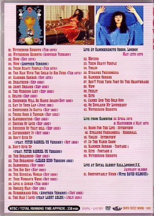 The third installment of the "BOYS NEXT DOOR" label, which provides valuable and high quality videos, is a compilation of promotional videos and live footage from KATE BUSH's best existing master tapes! This time it was released on DVD-R, and it is a masterpiece with a recording time of over 200 minutes. Centered around the PV collection released on LD over 10 years ago, unrecorded songs and alternate take versions of the same songs are recorded in chronological order. Although the image quality varies somewhat depending on the song, all of them boast the highest possible image quality, so we can recommend them with confidence. There are many songs that were not made into software and ended up only being broadcast on air, such as another version of "Wuthering Heights" that we have been used to for many years, and "Don't Give Up", a duet with Peter Gabriel, that was released in the UK and US. There are many highlights such as the completely different construction depending on the version. In particular, the UK version has an impressive image of the two singing while hugging each other endlessly, which I think will be nostalgic for those of the real-time generation. The second half includes footage of the classic 1979 Hammersmith performance, and then other performances from the same tour (it seems to have been shot mainly around the Hamburg performance)! This is a rare video that has been buried in the shadow of standard items. Furthermore, this video is a complete version that includes rare footage that was not included in the local German on-air version. This is a valuable video that reveals some of the mysteries about her (even the recording scene!), so don't miss it. And finally, there is a video of David Gilmour unexpectedly jumping into a live performance in 2002, which shocked the fans and the audience who were there. Naturally, it was a huge surprise, so the camera crew wasn't present, but this is a rare footage from an audience shot that was accidentally (!?) recorded. Be sure to purchase this along with "THIS WOMAN'S VISUAL WORKS ~TV Appearances~" which will be released at the same time as this work! The recording time is 230 minutes in professional format with menu chapters.