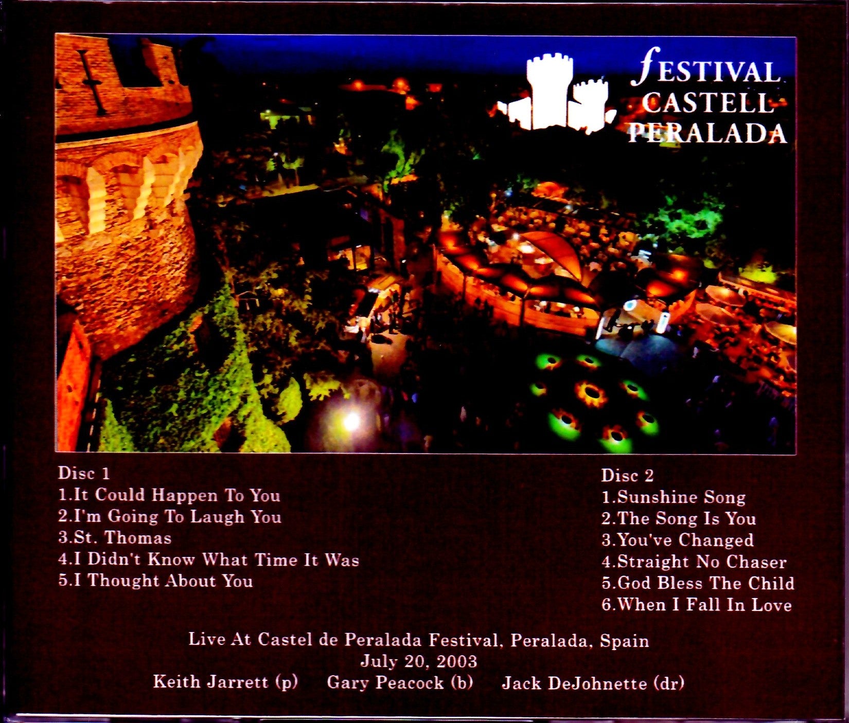Disc 1 1.It Could Happen To You 2.I'm Going To Laugh You 3.St. Thomas 4.I Didn't Know What Time It Was 5.I Thought About You Disc 2 1.Sunshine Song 2.The Song Is You 3.You've Changed 4.Straight No Chaser 5.God Bless The Child 6.When I Fall In Love Live at Peralada Castle Music Festival, Peralada, Spain 07/20/2003 Keith Jarrett (p) Gary・Peacock (b) Jack DeJohnette (dr)