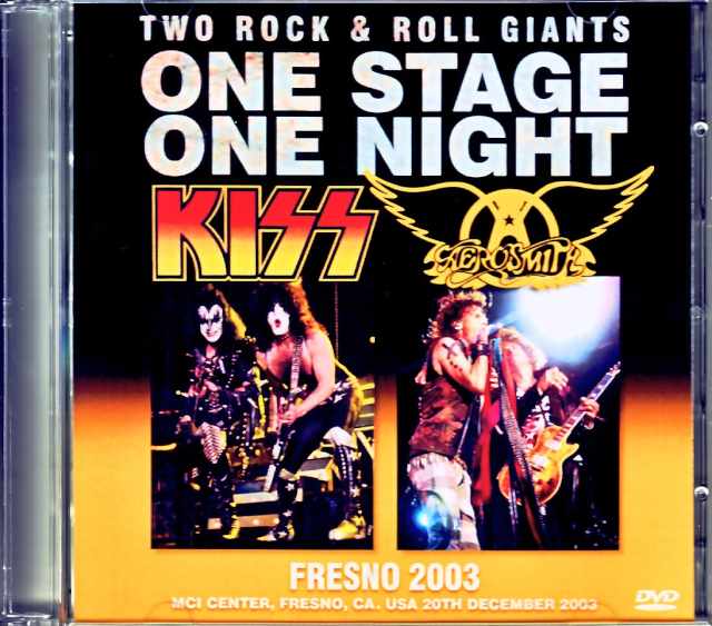 Live at MCI Center, Fresno, CA. USA 20th December 2003 AMAZING-SHOT!! Disc 1 : KISS 1. Introduction 2. Detroit Rock City 3. Deuce 4. Shout It Out Loud 5. Let Me Go, Rock 'n' Roll 6. Lick It Up 7. Firehouse 8. I Love It Loud 9. I Want You 10. God Of Thunder 11. 100,000 Years 12. Black Diamond 13. Beth 14. Love Gun 15. Rock And Roll All Nite Paul Stanley - Guitar & Vocal Gene Simmons - Bass & Vocal Tommy Thayer - Lead Guitar Peter Criss - Drums COLOUR NTSC Approx.92min. Disc 2 : AEROSMITH 1. Introduction 2. Let The Music Do The Talking 3. Love In An Elevator 4. Same Old Song And Dance 5. Pink 6. Jaded 7. Rag Doll 8. Rats In The Cellar 9. What It Takes 10. Stop Messin' Around 11. Baby Please Don't Go 12. Dream On 13. Toys In The Attic 14. Cryin' 15. Walk This Way 16. Band Introduction 17. Bass Solo 18. Sweet Emotion COLOUR NTSC Approx.87min. Steven Tyler - Vocals Joe Perry - Guitar Tom Hamilton - Bass Joey Kramer - Drums Brad Whitford - Guitar