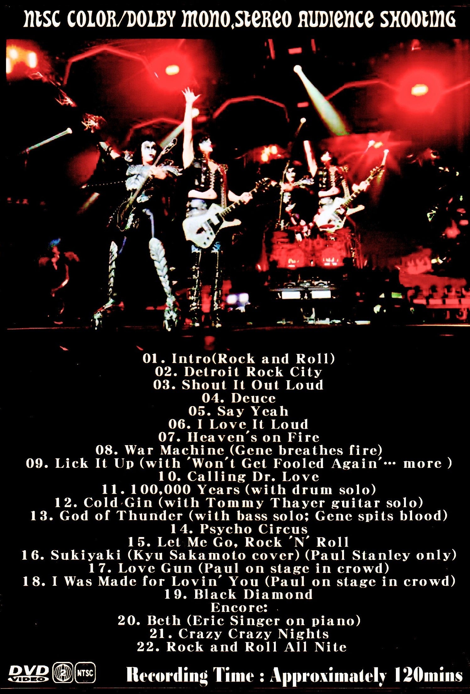 01. Intro(Rock and Roll) 02. Detroit Rock City 03. Shout It Out Loud 04. Deuce 05. Say Yeah 06. I Love It Loud 07. Heaven's on Fire 08. War Machine (Gene breathes fire) 09. Lick It Up (with 'Won't Get Fooled Again'... more ) 10. Calling Dr. Love 11. 100,000 Years (with drum solo) 12. Cold Gin (with Tommy Thayer guitar solo) 13. God of Thunder (with bass solo; Gene spits blood) 14. Psycho Circus 15. Let Me Go, Rock 'N' Roll 16. Sukiyaki (Kyu Sakamoto cover) (Paul Stanley only) 17. Love Gun (Paul on stage in crowd) 18. I Was Made for Lovin ' You (Paul on stage in crowd) 19. Black Diamond Encore: 20. Beth (Eric Singer on piano) 21. Crazy Crazy Nights 22. Rock and Roll All Nite