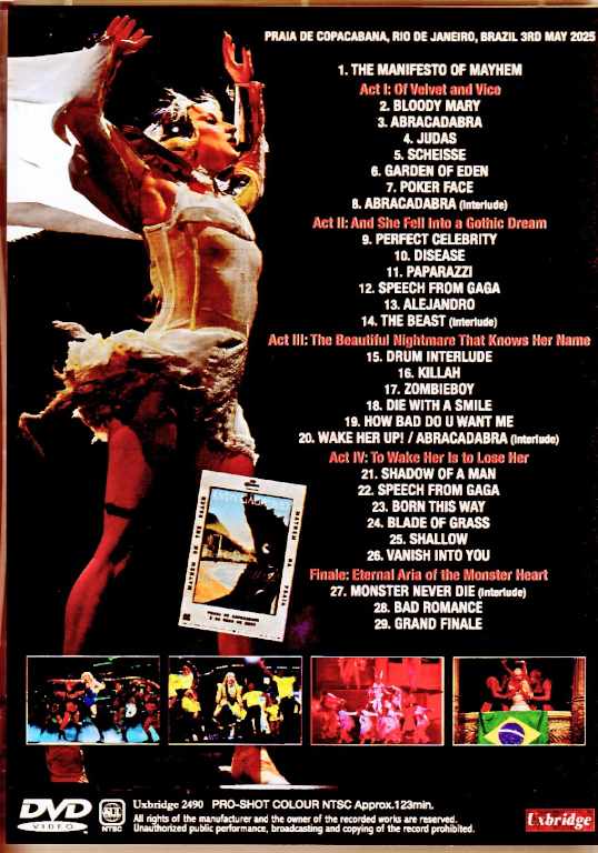 Live at Praia de Copacabana, Rio de Janeiro, Brazil 3rd May 2025 : PRO-SHOT COLOUR NTSC Approx.123min 1. The Manifesto Of MAYHEM -Act I: Of Velvet and Vice- 2. Bloody Mary 3. Abracadabra 4. Judas 5. Scheise 6. Garden Of Eden 7. Poker Face 8. Abracadabra (Interlude) -Act II: And She Fell Into a Gothic Dream- 9. Perfect Celebrity 10. Disease 11. Paparazzi 12. Speech From Gaga 13. Alejandro 14. The Beast (Interlude) -Act III: The Beautiful Nightmare That Knows Her Name- 15.Drum Interlude 16. Killah 17. Zombieboy 18. Die With A Smile 19. How Bad Do U Want Me 20. Wake Her Up!/Abracadabra (Interlude) -Act IV: To Wake Her Is to Lose Her- 21. Shadow Of A Man 22. Speech From Gaga 23. Born This Way 24. Blade Of Grass 25. Shallow 26. Vanish Into You -Finale: Eternal Aria of the Monster Heart- 27. Monster Never Die (Interlude) 28. Bad Romance 29. Grand Finale