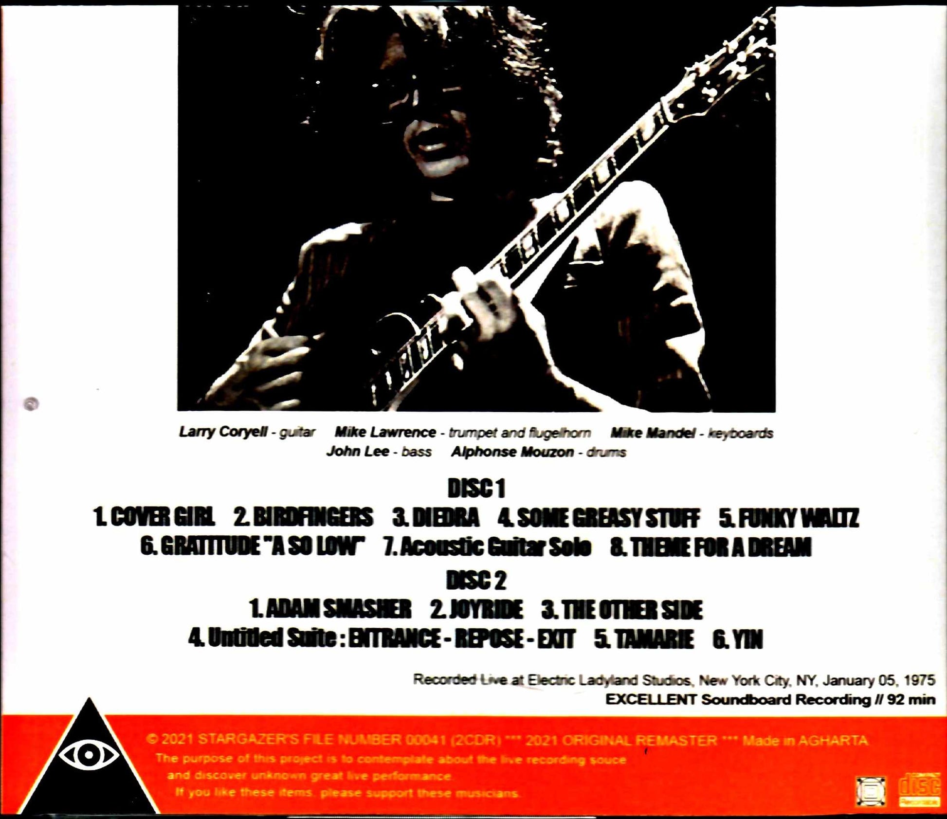 This is a soundboard live sound source of Larry Coryell's heyday at Eleventh House in 1975. It's a live show, but since it's in a studio, the audience is small, so at best it's easy to listen to, but at worst it doesn't have the sense of being there. The venue is Electric Lady Studio, founded by Jimi Hendrix. Coryell is a little less well-known among rock fans than jazz-rock guitarists such as John McLaughlin and Allan Holdsworth, but Eleventh House is a member of the Mahavishnu Orchestra, Return to Forever, and Weather Report. This is a great band that could really compete with the fusion bands that were all over the place at the time. Of particular note is Alphonse Muzone's high-speed drumming. The funky yet fast-paced snare is a masterpiece, and it drives Coryell's guitar at its peak. The performance is more rock-like and powerful than the fusion bands mentioned above, so it's a must-listen for those who shy away from the sound of "fusion" because they feel it's too soft. You're guaranteed to be blown away by the hot, hot jazz rock. Recorded Live at Electric Ladyland Studios, New York City, NY, January 05, 1975 EXCELLENT Soundboard Recording // 92 min DISC 1 01. COVER GIRL 02. BIRDFINGERS 03. DIEDRA 04. SOME GREASY STUFF 05. FUNKY WALTZ 06. GRATITUDE "A SO LOW" 07. Acoustic Guitar Solo 08. THEME FOR A DREAM DISC 2 01. ADAM SMASHER 02. JOYRIDE 03. THE OTHER SIDE 04. Untitled Suite : ENTRANCE - REPOSE - EXIT 05. TAMARIE 06. YIN Larry Coryell - guitar Mike Lawrence - trumpet and flugelhorn Mike Mandel - keyboards John Lee - bass Alphonse Mouzon - drums