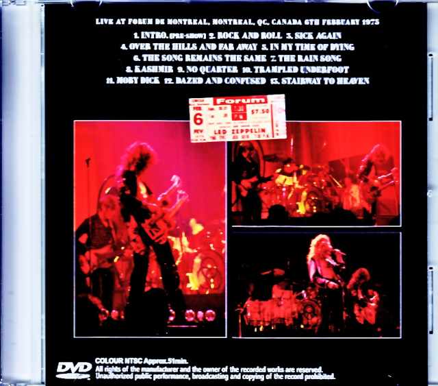 Forum de Montréal, Montreal, QC, Canada 6th February 1975 1. Intro (Pre-show) 2. Rock And Roll 3. Sick Again 4. Over The Hills And Far Away 5. In My Time Of Dying 6. The Song Remains The Same 7. The Rain Song 8. Kashmir 9. No Quarter 10. Trampled Underfoot 11. Moby Dick 12. Dazed & Confused 13. Stairway To Heaven COLOUR NTSC Approx.51min.
