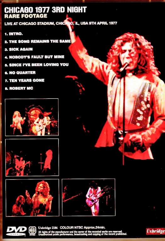 Chicago Stadium, Chicago, IL, USA 9th April 1977 AMAZING SHOT!!! 1. Intro 2. The Song Remains The Sam 3. Sick Again 4. Nobody's Fault But Mine 5. Since I've Been Loving You 6. No Quarter 7. Ten Years Gone 8. Robert MC COLOUR NTSC Approx.24min.