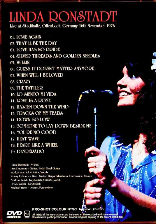 Live at Stadthalle, Offenbach, Germany 16th November 1976 PRO-SHOT 1. Lose Again 2. That'll Be The Day 3. Love Has No Pride 4. Silver Threads And Golden Needles 5. Willin' 6. Guess It Doesn't Matter Anymore 7. When Will I Be Loved 8. Crazy 9. The Tattler 10. Lo Siento Mi Vida 11. Love Is A Rose 12. Hasten Down The Wind 13. Tracks Of My Tears 14. Down So Low 15. Someone To Lay Down Beside Me 16. You're No Good 17. Heat Wave 18. Heart Like A Wheel 19. Desperado Linda Ronstadt - Vocals Dan Dugmore - Guitar, Pedal Steel Guitar Waddy Wachtel - Guitar, Vocals Kenny Edwards - Bass, Guitar, Banjo, Mandolin, Harmonica, Vocals Andrew Gold - Keyboards, Guitars, Vocals Brock Walsh - Keyboards Michael Botts - Drums, Percussions PRO-SHOT COLOUR NTSC Approx. 76 min.