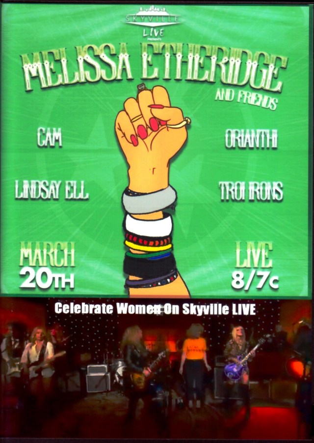 This 89-minute recording of Melissa Etheridge and other female musicians' performances was recorded in master quality and professional shots from the TV program "Skyville LIVE," which was recorded on March 20, 2017 in Nashville, Tennessee and aired on a webcast. In addition to Melissa, Cam, Lindsay Ell, Orianthi, Troy Irons and others also participated, and apart from a streaming problem with "Come To My Window," the performance was gorgeous and cute. 01.Introduction/02.Bring Me Some Water - Melissa Etheridge/03.Come To My Window - Melissa Etheridge & Cam/04.Criminal - Lindsay Ell/05.Waiting On You - Lindsay Ell/06.Lawless - Troi Irons/07.Today - Troi Irons & Melissa Etheridge/08.Call Me - Troi Irons/09.Frozen - Orianthi/10.How Do You Sleep - Orianthi/ 11.Pride & Joy - Orianthi/12.I've Been Loving You Too Long - Melissa Etheridge/13.Happy Birthday - Melissa Etheridge &Lindsay Ell/14.I'm The Only One - Melissa Etheridge &Lindsay Ell/15.Rock Me Baby - Melissa Etheridge &Lindsay Ell, Orianthi/16.Respect Yourself - All/17.Johnny B. Goode – All [Celebrate Women On Skyville : LIVE, Skyville at Nashville.TN March 20th 2017]