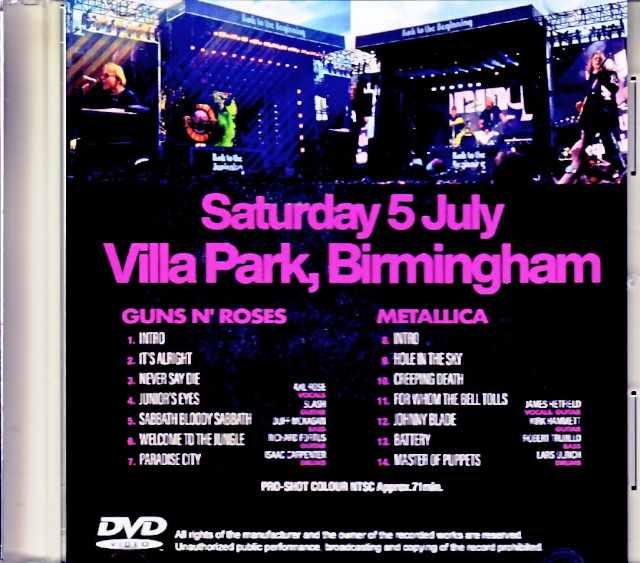 Villa Park, Birmingham, England 5th July 2025 PRO-SHOT GUNS N' ROSES 1. Intro 2. It's Alright 3. Never Say Die 4. Junior's Eyes 5. Sabbath Bloody Sabbath 6. Welcome To The Jungle 7. Paradise City Axl Rose - Vocals Slash - Guitar Duff McKagan - Bass Richard Fortus - Guitar Isaac Carpenter - Drums METALLICA 8. Intro 9. Hole In The Sky 10. Creeping Death 11. For Whom The Bell Tolls 12. Johnny Blade 13. Battery 14. Master Of Puppets James Hetfield - Vocals, Guitar Kirk Hammett - Guitar Robert Trujillo - Bass Lars Ulrich - Drums PRO-SHOT COLOUR NTSC Approx.71min.