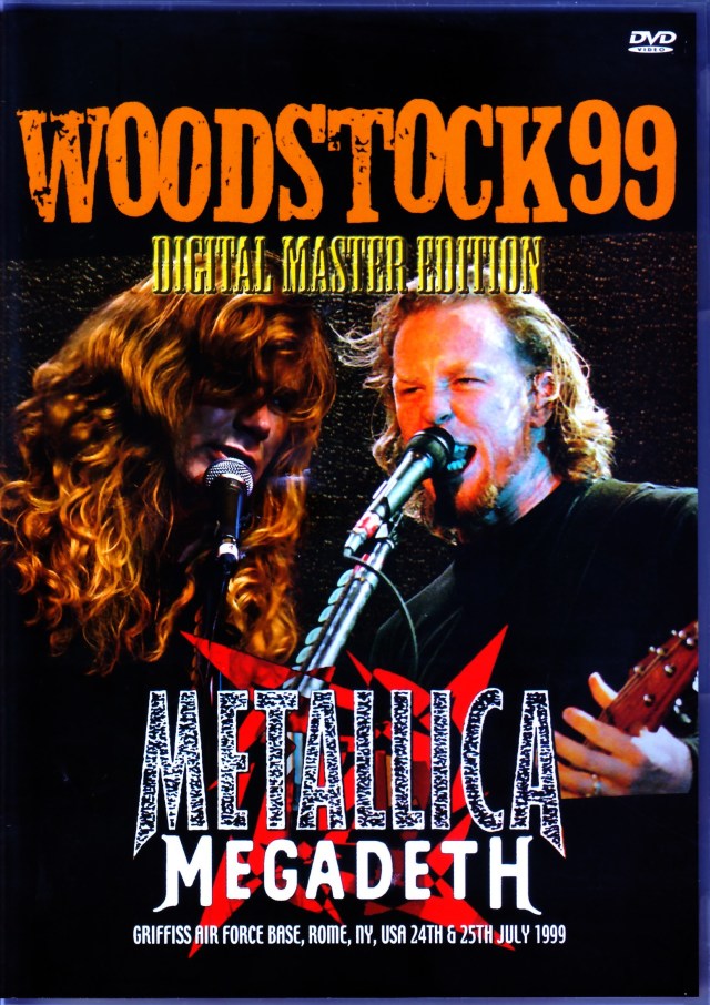 Live at "Woodstock 99: West Stage" Griffiss Air Force Base, Rome, NY. USA 24th & 25th July 1999 PRO-SHOT Disc 1(121:38) METALLICA Live at "Woodstock 99: East Stage" Griffiss Air Force Base, Rome, NY, USA 24th July 1999 1. Pre-Show 2. The Ecstasy Of Gold 3. So What 4. Master Of Puppets 5. For Whom The Bell Tolls 6. Fuel 7. King Nothing 8. Bleeding Me 9. Sad But True 10. Turn The Page 11. Wherever I May Roam 12. One 13. Fight Fire With Fire 14. Nothing Else Matters 15. Seek & Destroy 16. Creeping Death 17. Fixxxer Jam 18. Die, Die My Darling 19. Enter Sandman 20. Sabbra Cadabra / Until It Sleeps Jam 21. Battery 22. Creeping Death (Alternate Camera Angle) Disc 2(70:46) MEGADETH Live at "Woodstock 99: West Stage" Griffiss Air Force Base, Rome, NY. USA 25th July 1999 1. Introduction 2. Holy Wars... The Punishment Due 3. In My Darkest Hour 4. Reckoning Day 5. A Secret Place 6. Angry Again 7. She-Wolf 8. A Tout Le Monde 9. Almost Honest 10. Crush 'Em 11. Use The Man 12. Trust 13. Sweating Bullets 14. Symphony Of Destruction 15. Peace Sells PRO-SHOT COLOUR NTSC Approx.193min.