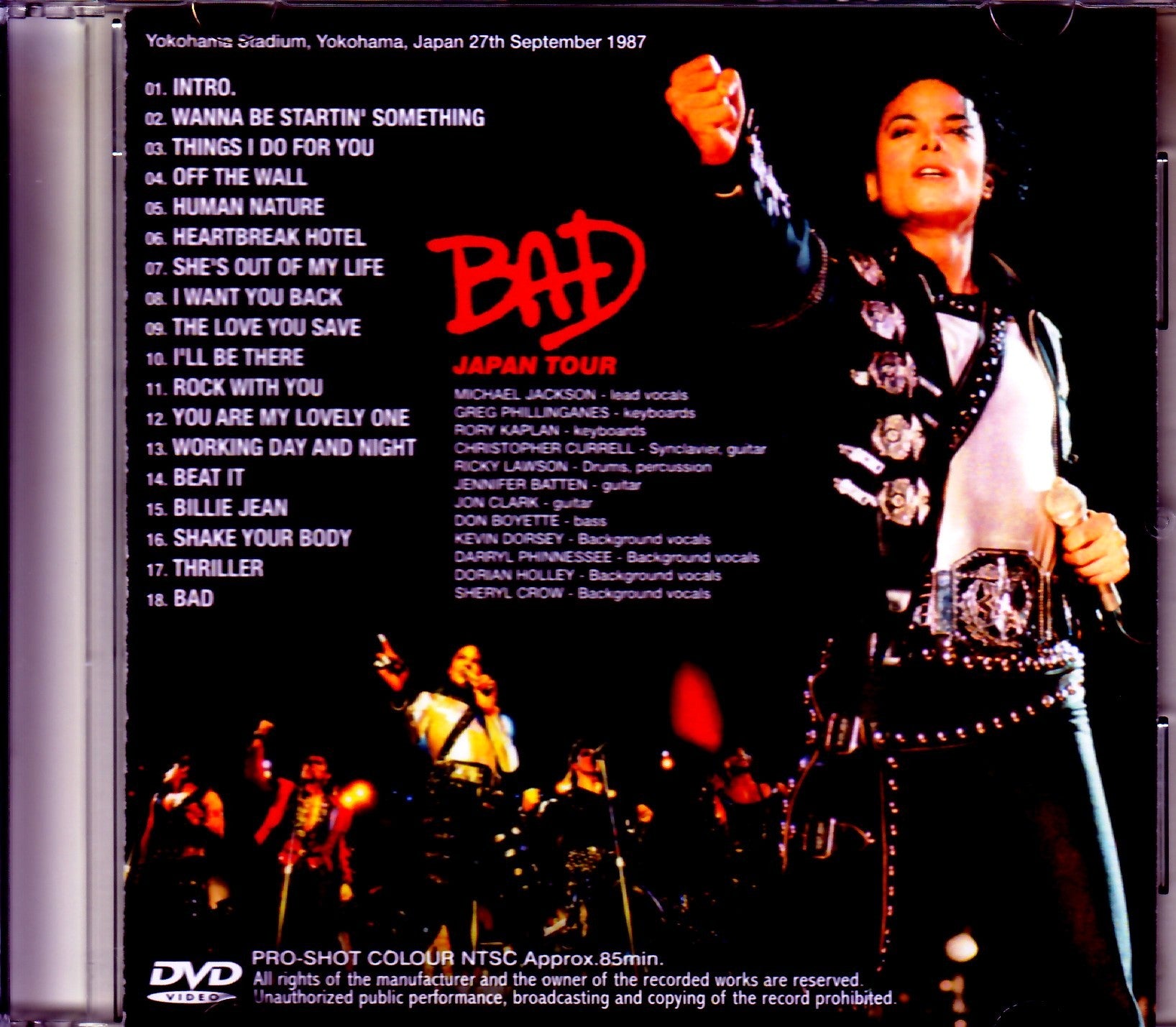 1. Intro 2. Wanna Be Startin' Something 3. Things I Do For You 4. Off The Wall 5. Human Nature 6. Heartbreak Hotel 7. She's Out Of My Life 8. I Want You Back 9. The Love You Save 10 I'll Be There 11. Rock With You 12. You Are My Lovely One 13. Working Day And Night 14. Beat It 15. Billie Jean 16. Shake Your Body 17. Thriller 18. Bad Michael Jackson - lead vocals Greg Phillinganes - keyboards Rory Kaplan - keyboards Christopher Currell - Synclavier, guitar Ricky Lawson - Drums, percussion Jennifer Batten - guitar Jon Clark - guitar Don Boyette - bass Kevin Dorsey - Background vocals Darryl Phinnessee - Background vocals Dorian Holley - Background vocals Sheryl Crow - Background vocals PRO-SHOT COLOR NTSC Approx.85min.