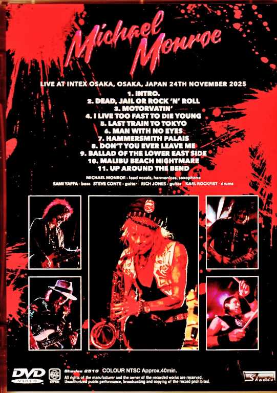 Intex Osaka, Osaka, Japan 24th November 2025 AMAZING SHOT!!!! 1. Intro 2. Dead, Jail Or Rock 'N' Roll 3. Motorvatin' 4. I Live Too Fast To Die Young 5. Last Train To Tokyo 6. Man With No Eyes 7. Hammersmith Palais 8. Don't You Ever Leave Me 9. Ballad Of The Lower East Side 10. Malibu Beach Nightmare 11. Up Around The Bend Michael Monroe - lead vocals, harmonicas, saxophone Steve Conte - guitar Rich Jones - guitar Sami Yaffa - bass Karl Rosqvist - drums COLOUR NTSC Approx.40min.