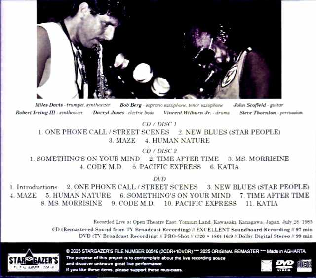 Recorded Live at Open Theatre East, Yomiuri Land, Kawasaki, Kanagawa, Japan, July 28, 1985 CD (Remastered Sound from TV Broadcast Recording) // EXCELLENT Soundboard Recording // 97 min DVD (TV Broadcast Recording) // PRO-Shot // (720 × 480) 16:9 // Dolby Digital Stereo // 99 min CD / DISC 1 1. ONE PHONE CALL / STREET SCENES 2. NEW BLUES (STAR PEOPLE) 3. MAZE 4. HUMAN NATURE CD / DISC 2 1. SOMETHING'S ON YOUR MIND 2. TIME AFTER TIME 3. MS. MORRISINE 4. CODE M.D. 5. PACIFIC EXPRESS 6. KATIA DVD 1. Introductions 2. ONE PHONE CALL / STREET SCENES 3. NEW BLUES (STAR PEOPLE) 4. MAZE 5. HUMAN NATURE 6. SOMETHING'S ON YOUR MIND 7. TIME AFTER TIME 8. MS. MORRISINE 9. CODE M.D. 10. PACIFIC EXPRESS 11. KATIA Miles Davis - trumpet, synthesizer Bob Berg - soprano saxophone, tenor saxophone John Scofield - guitar Robert Irving III - synthesizer Darryl Jones - electric bass Vincent Wilburn Jr. - drums Steve Thornton - percussion
