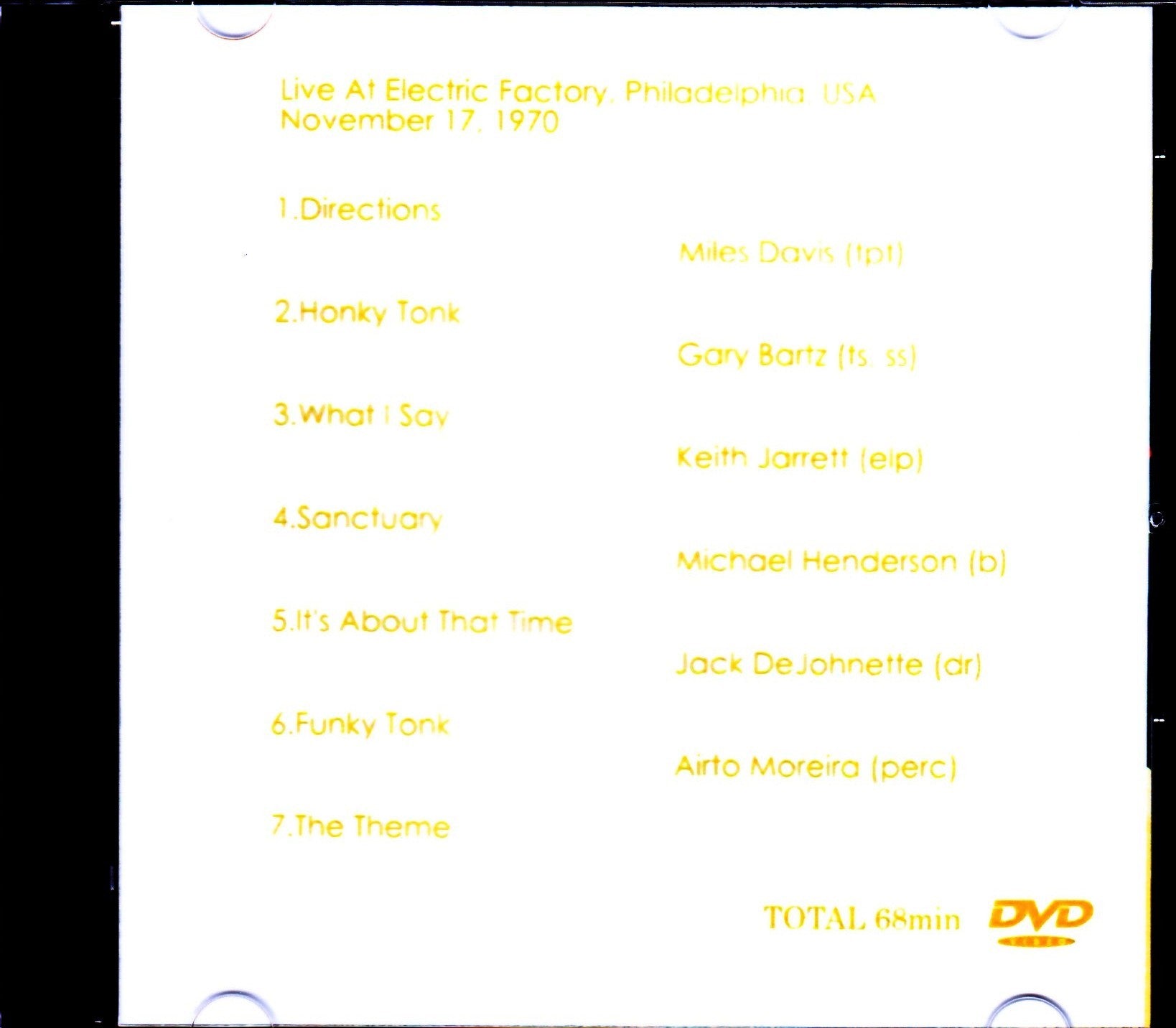 Recorded on November 17, 1970, a super high-tension live performance at the famous live house "Electric Factory" in Philadelphia. From the opening, Miles' feeling of ``I'm going to fly tonight!'' is conveyed directly with the fresh and powerful sound that you can never hear in a hall performance. Of course, Keith Jarrett's play also develops a hard battle that is as hard as Miles, and the listening response is also perfect. There are some blurred parts along the way, but the image quality of this disc is the best ever. A definitive edition that is a must-have and must-listen for fans has been released. Live at Electric Factory, Philadelphia 11/17/1970 1.Directions 2.Honky Tonk 3.What I Say 4.Sanctuary 5.It's About That Time 6.Funky Tonk 7.The Theme 68min Miles Davis (tpt ) Gary Bartz (TS, SS) Keith Jarrett (ELP) Michael Henderson (B) Jack DeJohnette (DR) Iato Moreira (PERC)