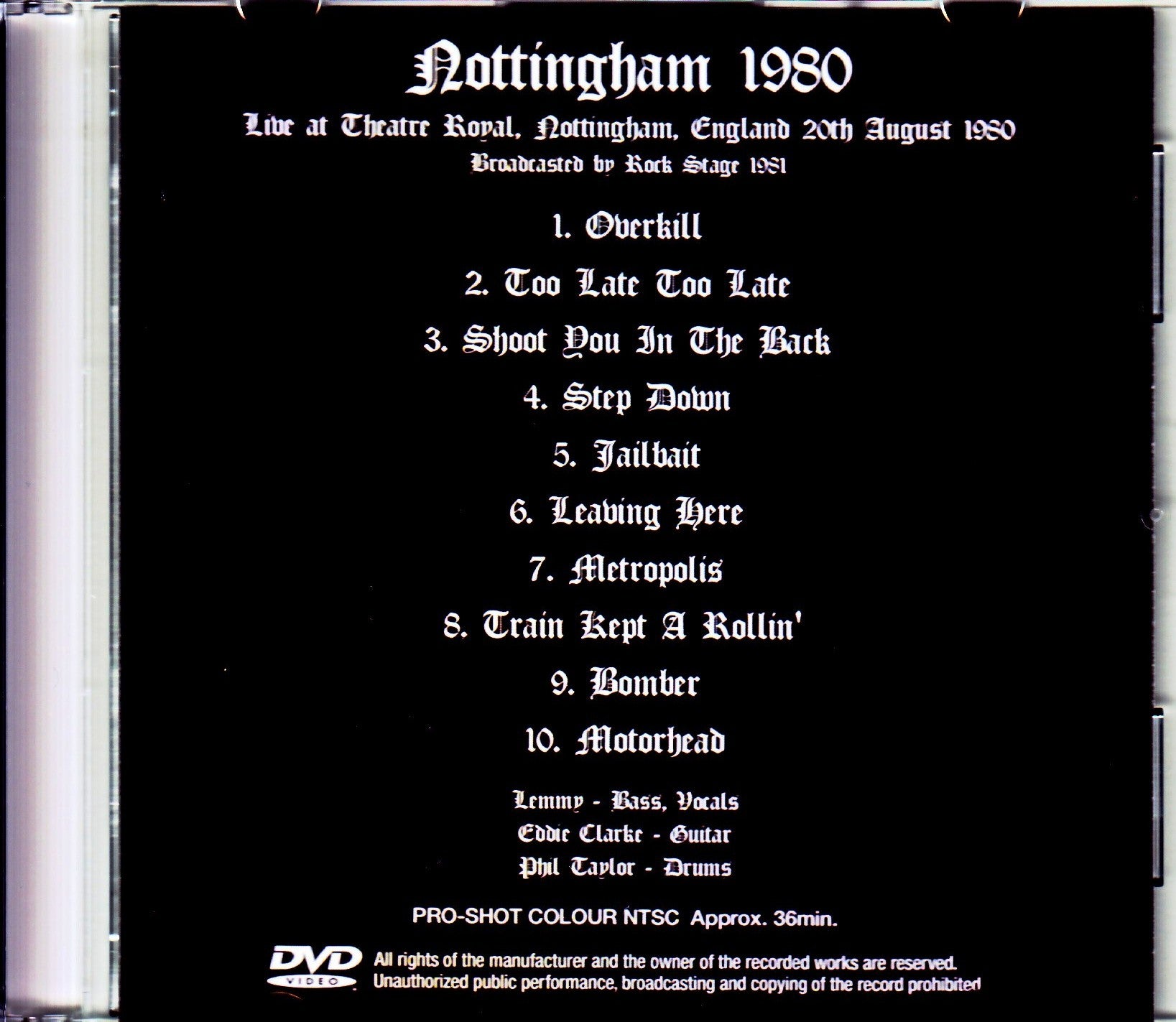 1. Overkill 2. Too Late Too Late 3. Shoot You In The Back 4. Step Down 5. Jailbait 6. Leaving Here 7. Metropolis 8. Train Kept A Rollin' 9. Bomber 10. Motorhead Lemmy - Bass, Vocals Eddie Clarke - Guitar Phil Taylor - Drums PRO-SHOT COLOR NTSC Approx. 36min.