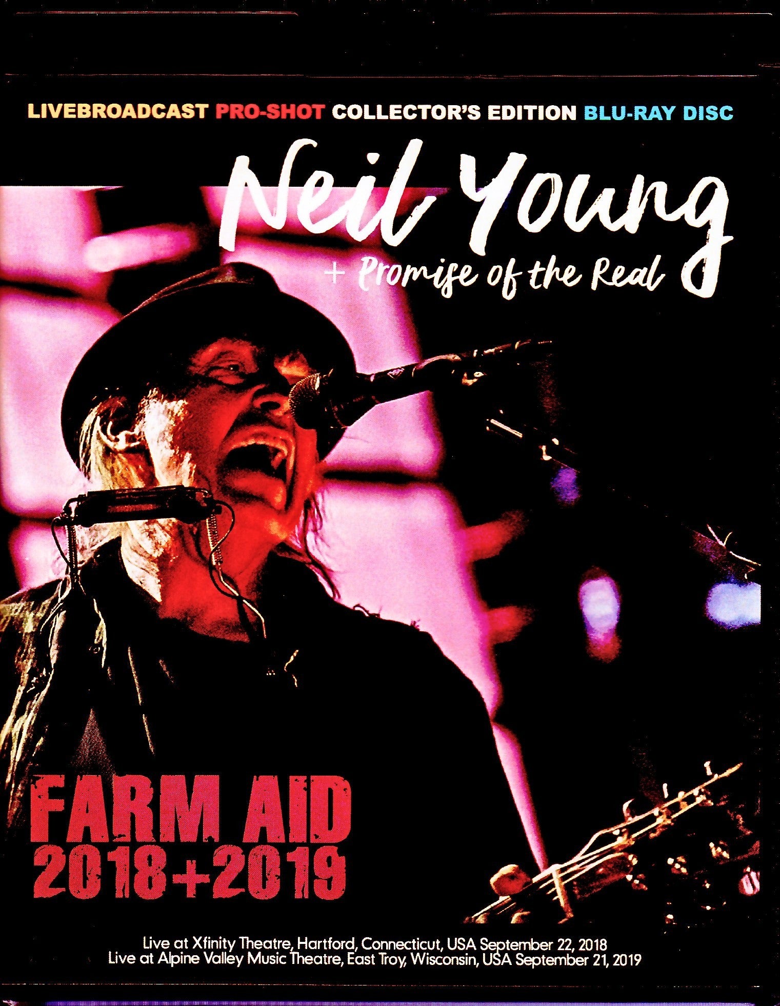 Neil Young + Promise of the Real's 2018 and 2019 live pro-shot footage from the annual live event "Farm Aid" is now available on Blu-ray in high resolution full HD quality! Recorded with professional shot footage of stages in Hartford, Connecticut on September 22, 2018, and East Troy, Wisconsin in 2019. Unfortunately, there is no co-starring part with guests, but the stage of Neil Young + Promise of the Real is recorded in professional shot video, and the set list is almost changed, making this a must-see live video available on Blu-ray. Delivered in high quality! FARM AID 2018 01. Introduction 02. Tell Me Why 03. Field Of Opportunity 04. Show Me 05. Powderfinger 06. Heart Of Gold 07. Ohio 08. Children Of Destiny 09. Love And Only Love Live at Xfinity Theatre, Hartford, Connecticut , USA, September 22, 2018 FARM AID 2019 01. Introduction 02. Are You Ready For The Country? 03. Workin' Man 04. Homegrown 05. Harvest Moon 06. Heart Of Gold 07. Throw Your Hatred Down 08. Rockin' In The Free World 09. Roll Another Number (For The Road) Live at Alpine Valley Music Theatre, East Troy, Wisconsin, USA, September 21, 2019 NTSC 16:9 Full HD Linaer PCM Stereo time. 96min.