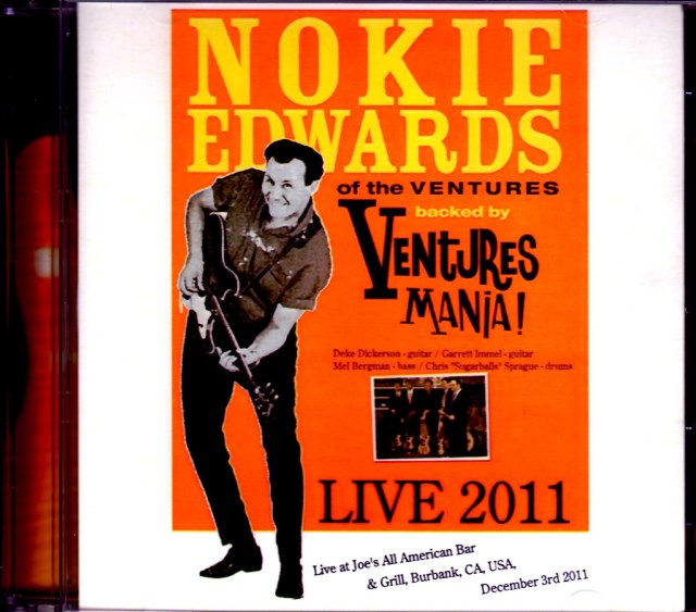 The Ventures' first bassist and second lead guitarist Nokie Edwards and the Ventures Mania led by modern surf rocker guitarist Dik Dickerson performed live at Joe's All American Bar & Grill, Burbank, California on December 3, 2011, in a superb high-quality audience recording. The first set is a live performance by the Ventures Mania led by Dik Dickerson, and the second set is a performance with the Ventures Mania led by Nokie Edwards. In the same year, they released "ventures mania! With Nokie Edwards - Bound & Side Jacked Again!" only on import, and the first set mainly featured songs from that album. And in the second set, Nokie Edwards participated and performed their signature songs such as "Walk Don't Run", "Diamond Head", "Slaughter On 10th Avenue", "Pipeline", "Caravan", and "Hawaii Five-O". You can enjoy the extremely rare live performance with ultra-high quality audience sound that is comparable to a stereo sound board sound source. DISC 1 SET 1: VenturesMania! 1. Intro 2. Mutant Bem 3. Besame Mucho 4. Mels Patented Anti-Humor 5. Hones Engine 6. 00-711 7. He Never Came Back 8. Ginza Lights 9. Lullaby Of The Leaves 10. Fidelio 11. Rightside Faster 12. Mels Excuse 13. 2000 LB Bee part 1 14. Rescue The Falling Mosrite 15. Bound And Sidejacked Again! 16. Nancy's Minuet 17. Journey To The Stars 18. Deke Pitches Merch 19. Pedal Pusher DISC 2 SET 2: Nokie Edwards and VenturesMania! 1. Intro 2. Walk Don't Run 3. Apache 4. Diamond Head 5. Black Sand Beach 6. House Of The Rising Sun 7. Driving Guitars 8. Surf Rider 9. Tears In Heaven 10. Slaughter On 10th Avenue 11. Penetration 12. Secret Agent Man 13. Pipeline 14. Hawaii 5-0 15. Caravan 16. Wipe Out 17. Good Night Eveybody, Drive Safe, Buy Merch Live at Joe's All American Bar & Grill, CA , USA, December 3rd 2011 Nokie Edwards – guitar Deke Dickerson – guitar Garrett Immel – guitar Mel Bergman – bass Chris “Sugarballs” Sprague – drums