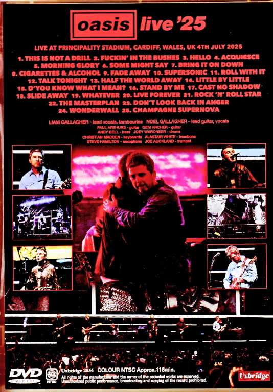 Principality Stadium, Cardiff, Wales, UK 4th July 2025 AMAZING SHOT!!! 1. This Is Not A Drill 2. Fuckin' In The Bushes 3. Hello 4. Acquiesce 5. Morning Glory 6. Some Might Say 7. Bring It On Down 8. Cigarettes & Alcohol 9. Fade Away 10. Supersonic 11. Roll With It 12. Talk Tonight 13. Half The World Away 14. Little By Little 15. D’You Know What I Mean? 16. Stand By Me 17. Cast No Shadow 18. Slide Away 19. Whatever 20. Live Forever 21. Rock 'n' Roll Star 22. The Masterplan 23. Don’t Look Back In Anger 24. Wonderwall 25. Champagne Supernova COLOUR NTSC Approx.118min.