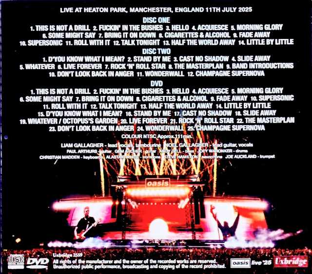 Live at Heaton Park, Manchester, UK 11th July 2025 : from Original Audience Recordings / COLOUR NTSC Approx.111min Disc 1 : 1. This Is Not A Drill 2. Fuckin' In The Bushes 3. Hello 4. Acquiesce 5. Morning Glory 6. Some Might Say 7. Bring It On Down 8. Cigarettes & Alcohol 9. Fade Away 10. Supersonic 11. Roll With It 12. Talk Tonight 13. Half The World Away 14. Little By Little Disc 2 : 1. D’You Know What I Mean? 2. Stand By Me 3. Cast No Shadow 4. Slide Away 5. Whatever / Octopus's Garden 6. Live Forever 7. Rock 'n' Roll Star 8. The Masterplan 9. Band Introductions 10. Don’t Look Back In Anger 11. Wonderwall 12. Champagne Supernova DVD : 1. This Is Not A Drill 2. Fuckin' In The Bushes 3. Hello 4. Acquiesce 5. Morning Glory 6. Some Might Say 7. Bring It On Down 8. Cigarettes & Alcohol 9. Fade Away 10. Supersonic 11. Roll With It 12. Talk Tonight 13. Half The World Away 14. Little By Little 15. D’You Know What I Mean? 16. Stand By Me 17. Cast No Shadow 18. Slide Away 19. Whatever 20. Live Forever 21. Rock 'n' Roll Star 22. The Masterplan 23. Don’t Look Back In Anger 24. Wonderwall 25. Champagne Supernova Liam Gallagher - lead vocals, tambourine / Noel Gallagher - lead guitar, vocals / Paul Arthurs – guitar / Gem Archer – guitar / Andy Bell – bass / Joey Waronker - drums