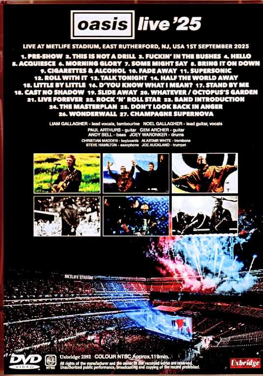 Live at MetLife Stadium, East Rutherford, NJ, USA 1st September 2025 : COLOUR NTSC Approx.119min 1.Pre-Show 2. This Is Not A Drill 3. Fuckin' In The Bushes 4. Hello 5. Acquiesce 6. Morning Glory 7. Some Might Say 8. Bring It On Down 9. Cigarettes & Alcohol 10. Fade Away 11. Supersonic 12. Roll With It 13. Talk Tonight 14. Half The World Away 15. Little By Little 16. D'You Know What I Mean? 17. Stand By Me 18. Cast No Shadow 19. Slide Away 20. Whatever/Octopus's Garden 21. Live Forever 22. Rock 'N' Roll Star 23. Band Introduction 24. The Masterplan 25. Don't Look Back in Anger 26. Wonderwall 27. Champagne Supernova Liam Gallagher - lead vocals, tambourine / Noel Gallagher - lead guitar, vocals / Paul Arthurs – guitar / Gem Archer – guitar / Andy Bell – bass / Joey Waronker - drums