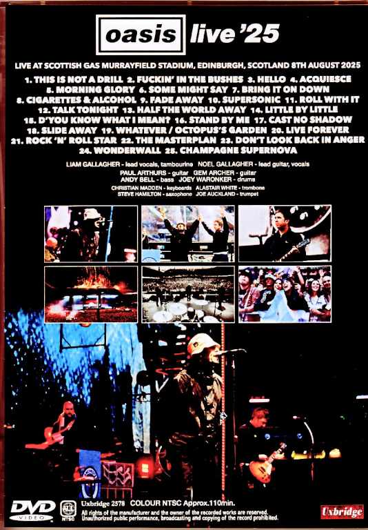 Live at Scottish Gas Murrayfield Stadium, Edinburgh, Scotland 8th August 2025 / COLOUR NTSC Approx.110min 1. This Is Not A Drill 2. Fuckin' In The Bushes 3. Hello 4. Acquiesce 5. Morning Glory 6. Some Might Say 7. Bring It On Down 8. Cigarettes & Alcohol 9. Fade Away 10. Supersonic 11. Roll With It 12. Talk Tonight 13. Half The World Away 14. Little By Little 15. D’You Know What I Mean? 16. Stand By Me 17. Cast No Shadow 18. Slide Away 19. Whatever 20. Live Forever 21. Rock 'n' Roll Star 22. The Masterplan 23. Don’t Look Back In Anger 24. Wonderwall 25. Champagne Supernova Liam Gallagher - lead vocals, tambourine / Noel Gallagher - lead guitar, vocals / Paul Arthurs – guitar / Gem Archer – guitar / Andy Bell – bass / Joey Waronker - drums