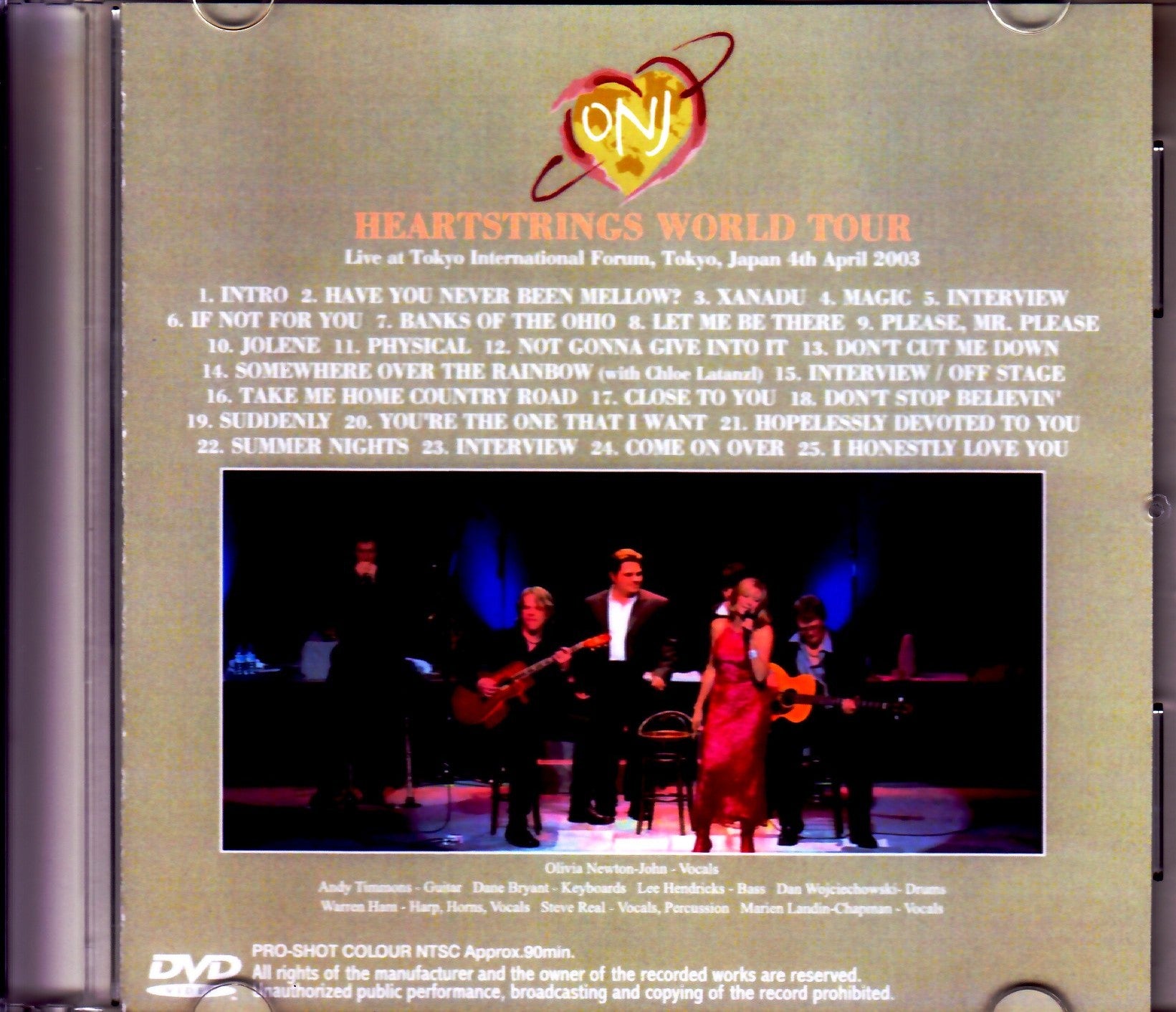 1. Intro 2. Have You Never Been Mellow 3. Xanadu 4. Magic 5. Interview 6. If Not For You 7. Banks Of The Ohio 8. Let Me Be There 9. Please, Mr. Please 10. Jolene 11. Physical 12. Not Gonna Give Into It 13. Don't Cut Me Down 14. Somewhere Over The Rainbow (with Chloe Latanzl) 15. Interview / Soundcheck / Off Stage 16. Take Me Home Country Road 17. Close To You 18. Don' t Stop Believin' 19. Suddenly 20. You're The One That I Want 21. Hopelessly Devoted To You 22. Summer Nights 23. Interview 24. Come On Over 25. I Honestly Love You Olivia Newton-John - Vocals Andy Timmons - Guitar Dane Bryant - Keyboards Lee Hendricks - Bass Dan Wojciechowski- Drums Warren Ham - Harp, Horns, Vocals Steve Real - Vocals,Percussion Marien Landin-Chapman - Vocals PRO-SHOT COLOUR NTSC Approx.90min.