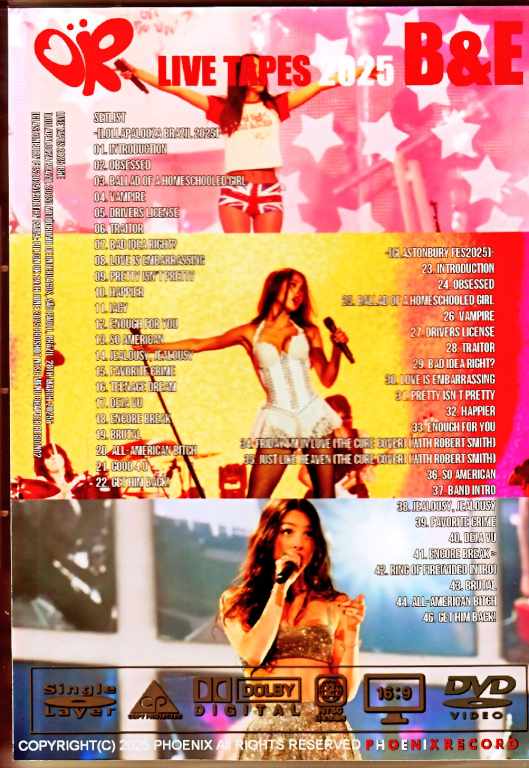 LIVE TAPES 2025 B&E [Lollapalooza Brazil 2025] Autódromo de Interlagos:São Paulo Brazil 28th March 2025&[Glastonbury Fes2025]Worthy Farm: Pilton UK 29th June 2025 Proshot NTSC Menu Chapter region02-[Lollapalooza Brazil 2025]-01. Introduction 02. Obsessed 03. Ballad of a homeschooled girl 04. Vampire 05. Drivers license 06. Traitor 07. Bad idea right? 08. Love is embarrassing 09. Pretty isn't pretty 10. Happier 11. Iacy 12. Enough for you 13. So american 14. Jealousy, jealousy 15. Favorite crime 16. Teenage dream 17. Deja vu 18. Encore Break 19. Brutal 20. All-american bitch 21. Good 4 u 22. Get him back!-[Glastonbury Fes2025]- 23. Introduction 24. Obsessed 25. Ballad Of A Homeschooled Girl 26. Vampire 27. Drivers License 28. Traitor 29. Bad Idea Right? 30. Love Is Embarrassing 31. Pretty Isn't Pretty 32. Happier 33. Enough For You 34. Friday I'm in Love (The Cure cover) (with Robert Smith) 35. Just Like Heaven (The Cure cover) (with Robert Smith) 36. So American 37. Band Intro 38. Jealousy, Jealousy 39. Favorite Crime 40. Deja Vu 41. Encore Break > 42. Ring Of Fire(Video intro) 43. Brutal 44. All-American Bitch 46. Get Him Back