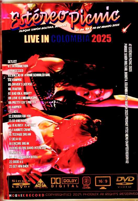 This is a Proshot DVD of Olivia's performance as headliner on the final day of Estéreo Picnic 2025, one of Colombia's largest music festivals, held on March 30th. Most of the 2025 performances were at major festivals around the world, and the Colombian performance captured on this DVD was incredibly powerful, with the audience's enthusiasm directly conveyed through the footage. Despite the compact set required for a festival, the intense performance was very satisfying. The video quality is consistent and high-quality, thanks to the use of a Pro source. at Estéreo Picnic 2025 Parque Simón Bolívar, Bogota, Colombia 30th March 2025 Proshot NTSC Menu Chapter region 02 01.Introduction 02.obsessed 03.ballad of a homeschooled girl 04.vampire 05.driver’s license 06.traitor 07.bad idea, right? 08.love is embarrasing 09.pretty isn’t pretty 10.happier 11.lacy 12.enough for you 13.so american 14.jealousy, jealousy 15.favorite crime 16.teenage dream 17.deja vu 18.Encore Break 19.Ring of Fire Band Interlude 20.brutal 21..all american bitch 22.good 4 u 23.get him back