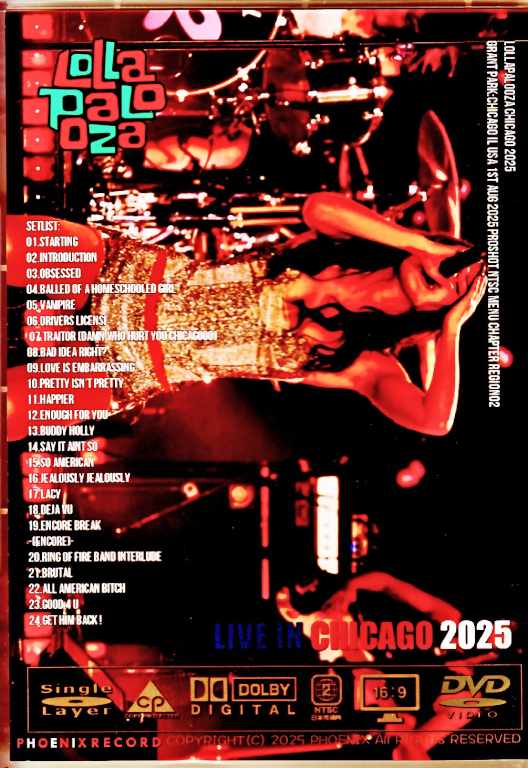 Lollapalooza Chicago 2025 Grant Park:Chicago IL USA 1st Aug 2025 Proshot NTSC Menu Chapter region02 01.Starting 02.Introduction 03.Obsessed 04.Balled of a Homeschooled Girl 05.Vampire 06.Drivers License 07.Traitor (damn who hurt you chicagooo) 08.Bad Idea Right? 09.Love is Embarrassing 10.Pretty isn't Pretty 11.Happier 12.Enough for You 13.Buddy Holly 14.Say it Aint So 15.So American 16.Jealously Jealously 17.Lacy 18.Deja Vu 19.Encore Break -(Encore)- 20.Ring of Fire Band Interlude 21.Brutal 22.All American Bitch 23.Good 4 u 24.Get Him Back !
